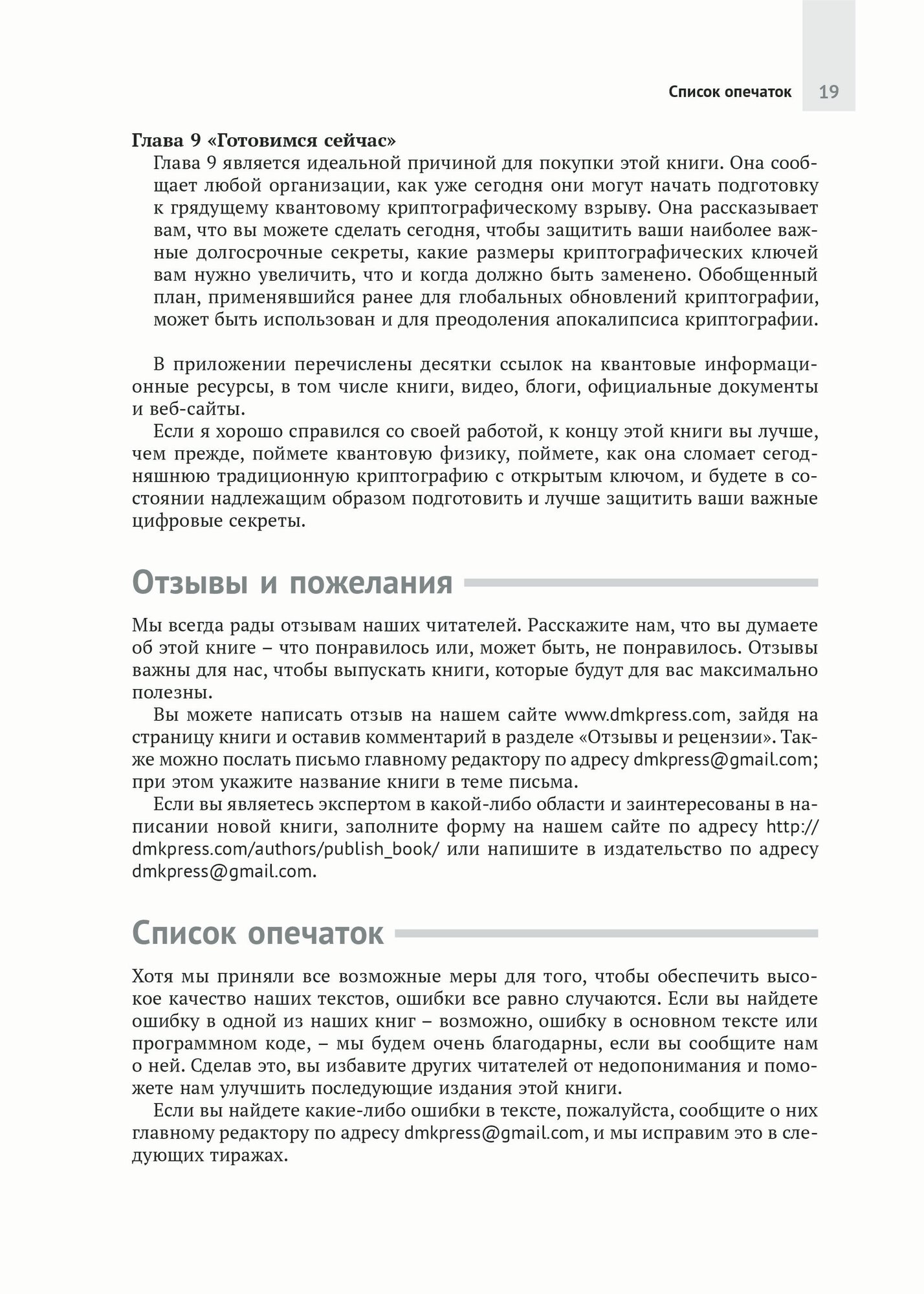В связи с бурным развитием технологий требования к компьютерной безопасности постоянно изменяются. Шифры, которые на сегодняшний день можно считать надежными, при использовании квантового компьютера будет легко взломать, и эта реальность уже не за горами. Вот почему необходимо уже сейчас готовиться к квантовому криптографическому прорыву, и эта книга послужит для читателя бесценным руководством к действию.