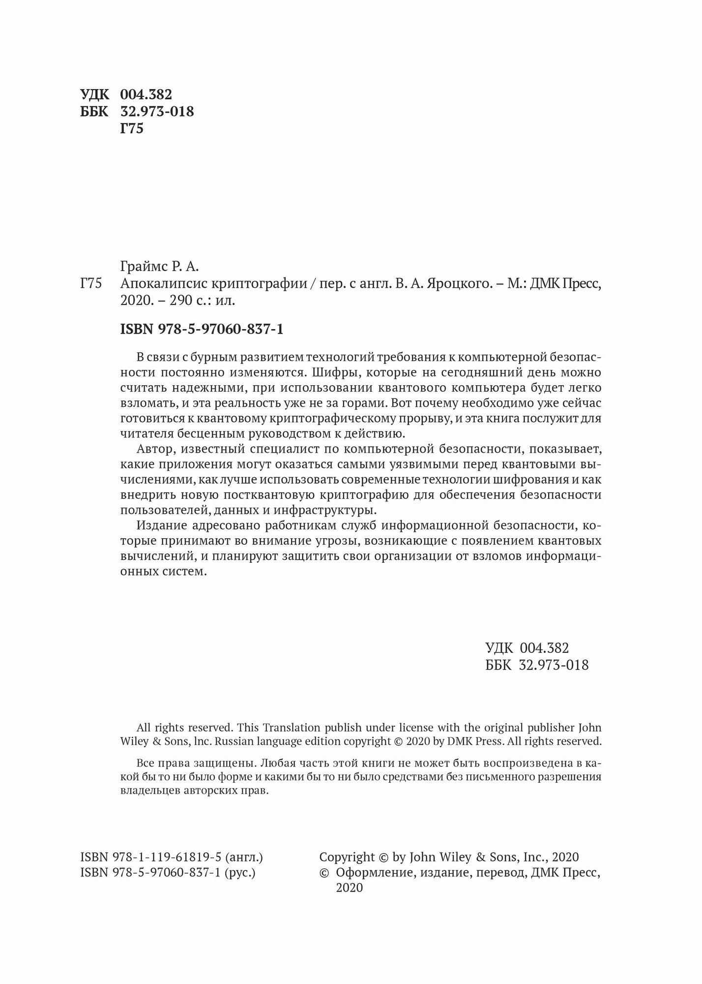 Апокалипсис криптографии. Подготовка к криптовалютным вычислениям (Роджер Граймс); ДМК Пресс, ДМК Пресс, 2021