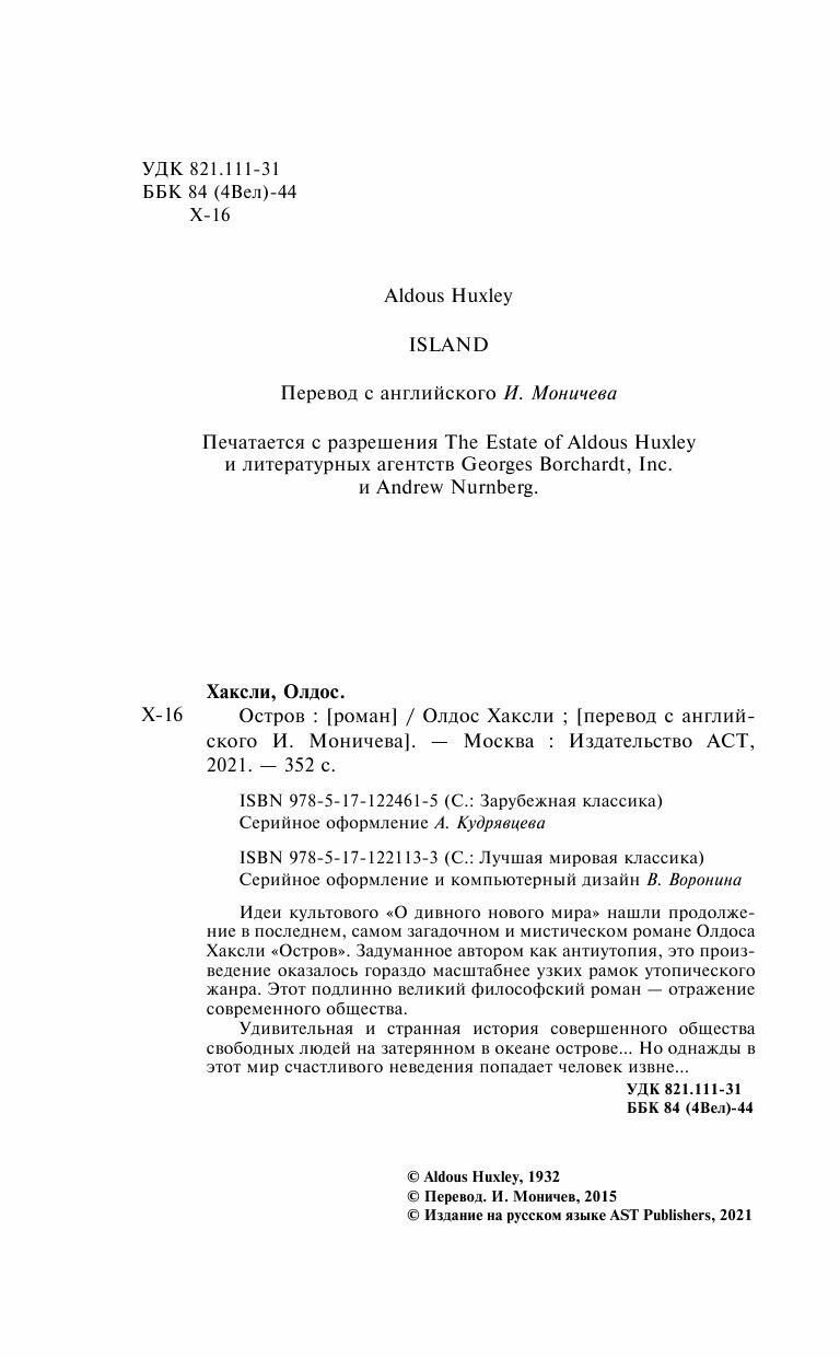 Идеи культового «О дивного нового мира» нашли продолжение в последнем, самом загадочном и мистическом романе Олдоса Хаксли «Остров». Задуманное автором как антиутопия, это произведение оказалось гораздо масштабнее узких рамок утопического жанра. Этот подлинно великий философский роман — отражение современного общества.