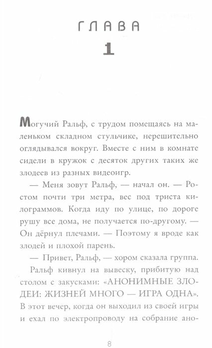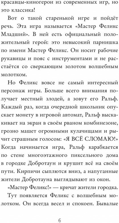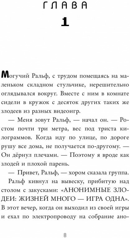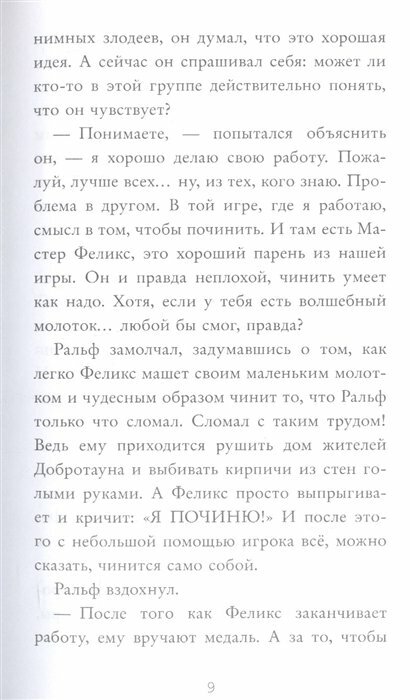 Когда вышла книга "Ральф против интернета", я был огорчен, что отсутствовала первая книга про Ральфа. И, спустя год, вы сумели меня порадовать - книга появилась. Качество книги хорошее: твердый переплет, мягкие страницы, средний размер шрифта, ну и конечно же, любимые герои в художественном воспроизведении. Однозначно рекомендую к покупке!