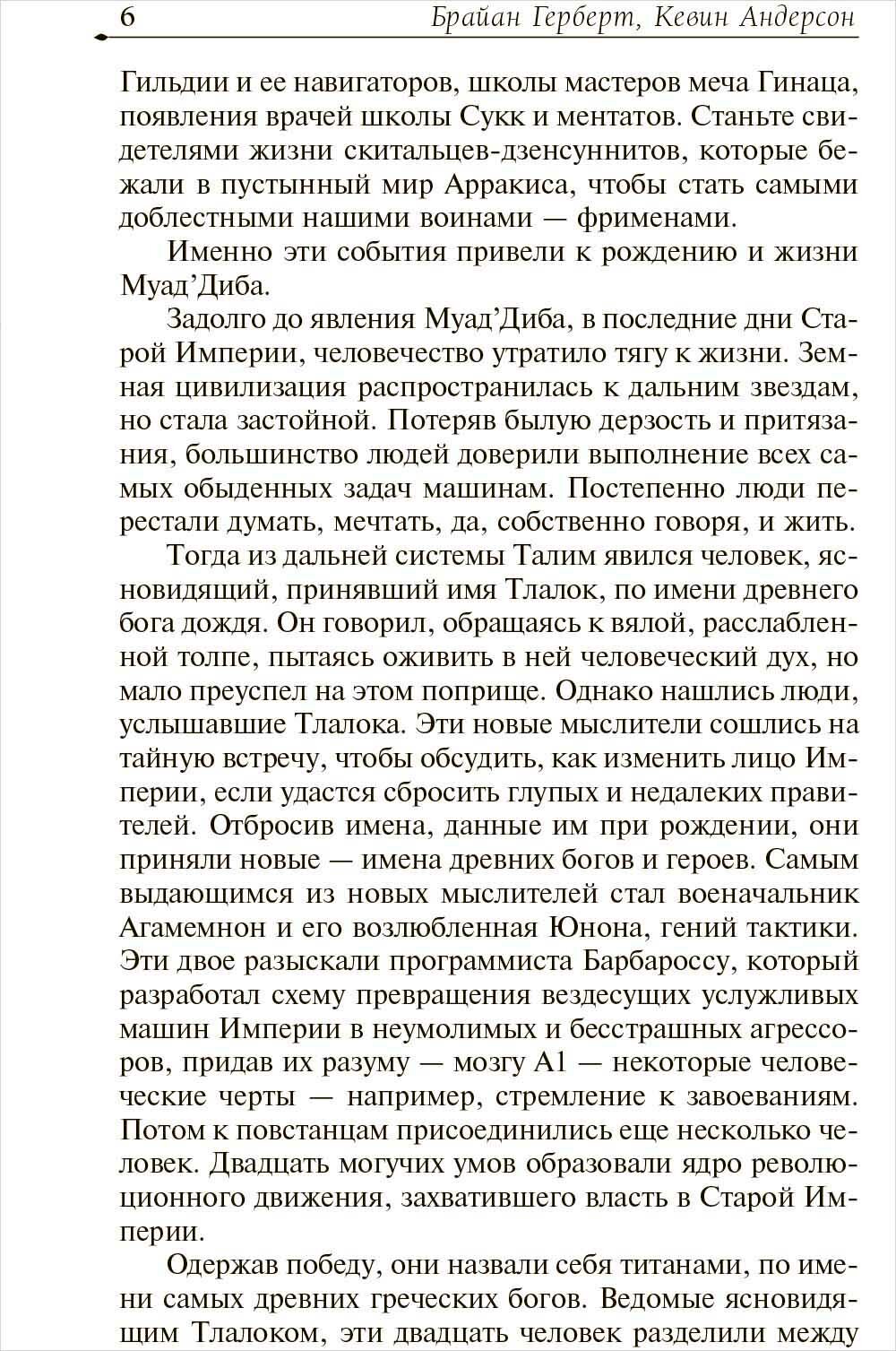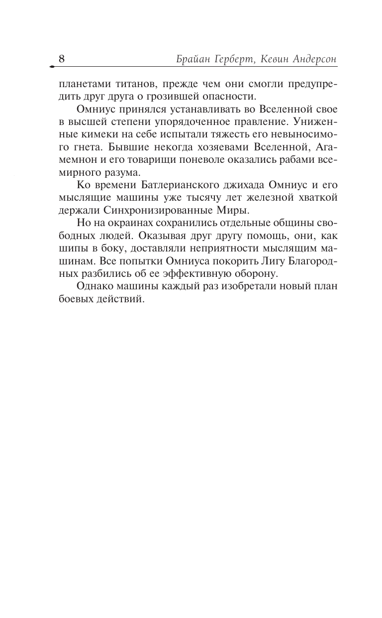 За десять тысячелетий до событий, разворачивающихся в «Дюне», задолго до рождения и воцарения Муад’Диба двадцать отчаянных умов захватили власть в Старой Империи, воспользовавшись зависимостью людей от технологий и наделив машины могучим интеллектом. Так началось многовековое господство мыслящих роботов под руководством жестокого всемирного разума Омниуса.