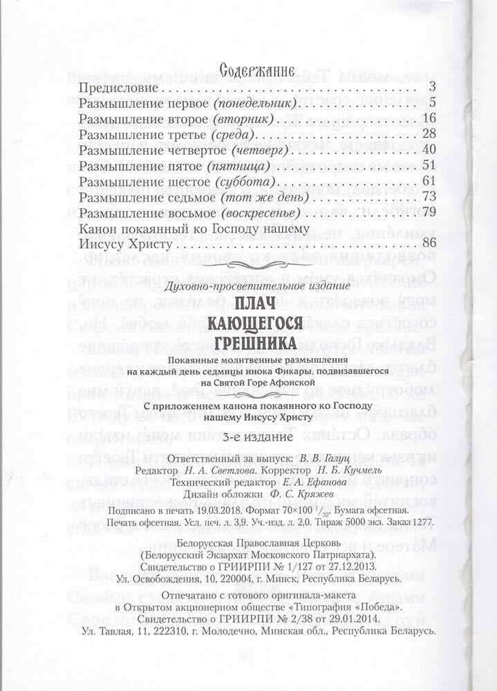 Плач кающегося грешника. Покаянные молитвенные размышления на каждый день седмицы инока Фикары (не указан); Издательство Белорусского Экзархата - Белорусской Православной Церкви, 2020