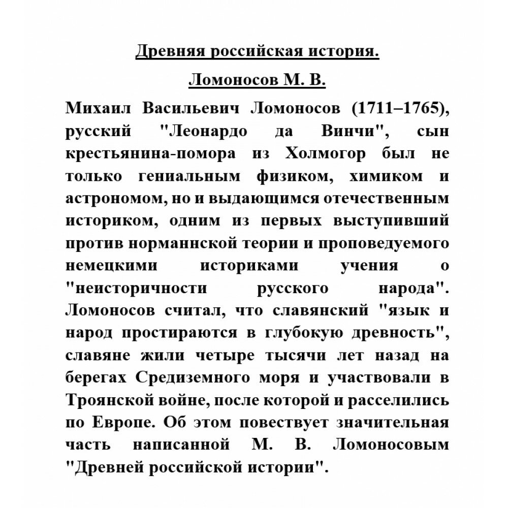 Михаил Васильевич Ломоносов (1711-1765), русский "Леонардо да Винчи", сын крестьянина-помора из Холмогор был не только гениальным физиком, химиком и астрономом, но и выдающимся отечественным историком, одним из первых выступивший против норманнской теории и проповедуемого немецкими историками учения о "неисторичности русского народа". Ломоносов считал, что славянский "язык и народ простираются в глубокую древность", славяне жили четыре тысячи лет назад на берегах Средиземного моря и участвовали в Троянской войне, после которой и расселились по Европе. Об этом повествует значительная часть написанной М.В. Ломоносовым "Древней российской истории".