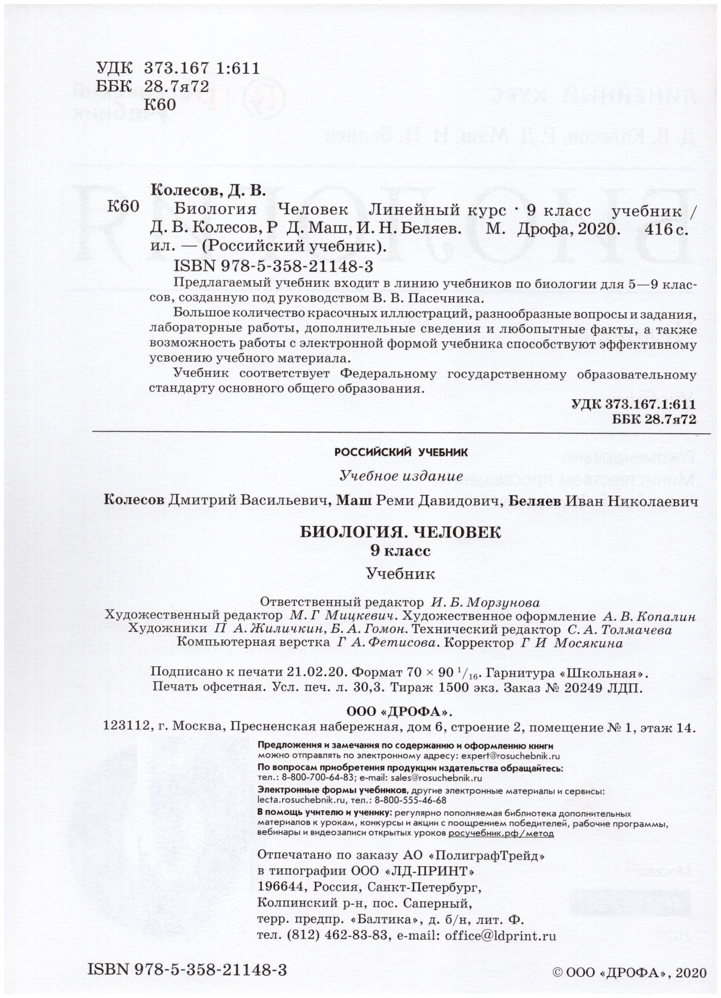 Биология. Человек. 9 класс. Учебник (Колесов Дмитрий Васильевич, Беляев Иван Николаевич, Маш Реми Давидович); Просвещение/Дрофа, 2022