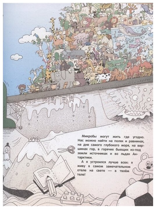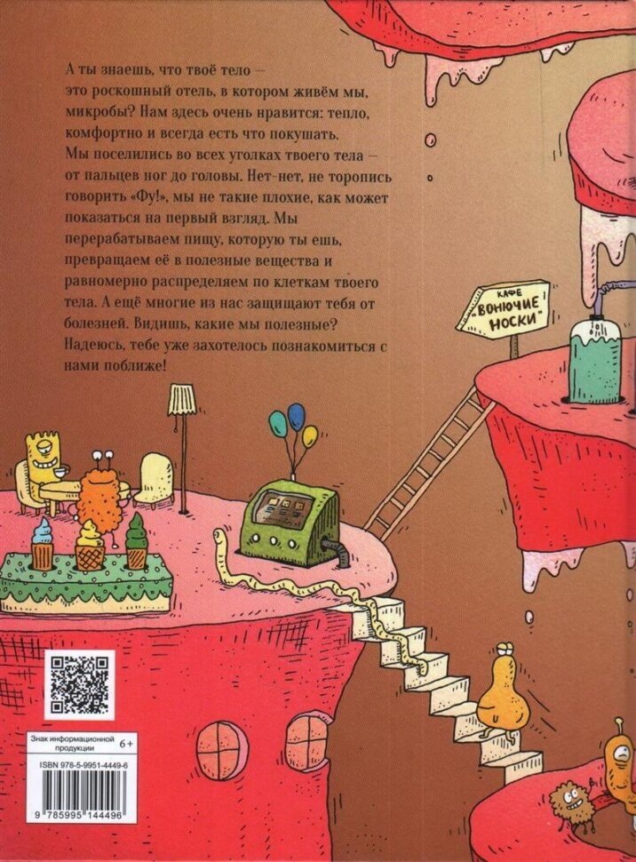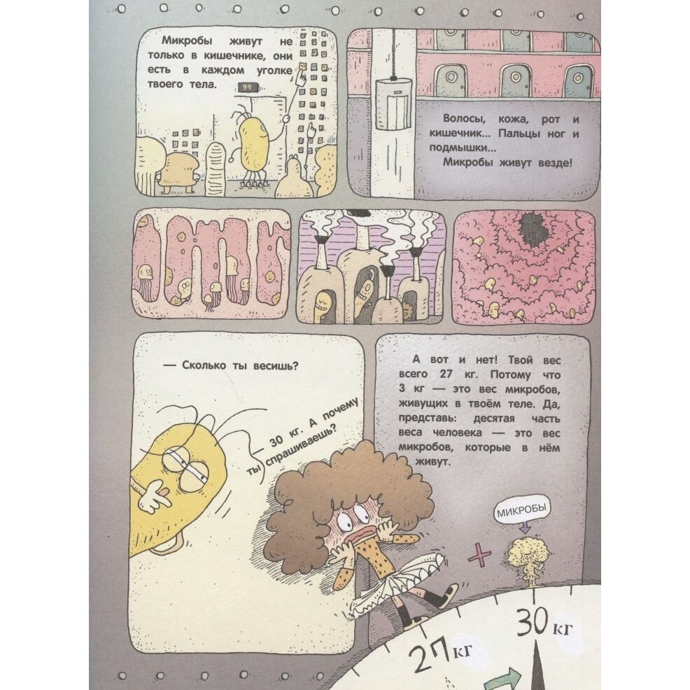 Очень симпатичная книжка, рассказывающая о микрожителях нашего организма. Читали с дочкой 6 лет, ей было очень интересно. Здесь даны общие представления о полезных и вредных микробах, есть интересные факты и остроумные иллюстрации. Думаю, оптимальный возраст читателей от 5 до 8 лет. Без скидки получается дороговато, но со скидкой цена адекватная.