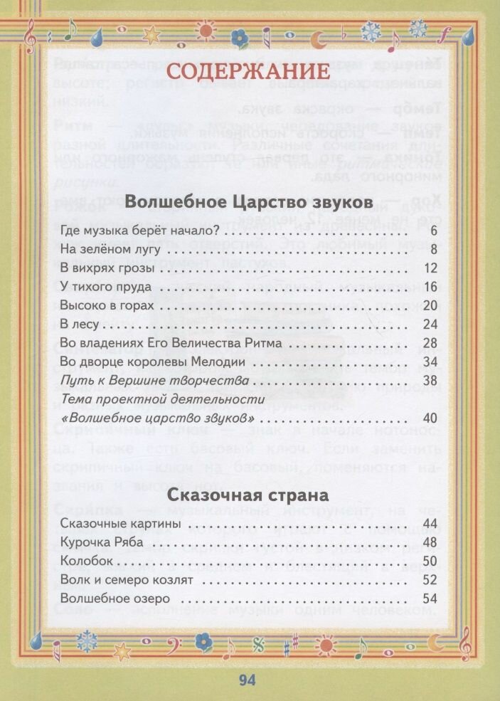Материал в учебнике представлен в форме путешествия по Музыкальному миру. Учащиеся знакомятся с основными понятиями музыки, а также лучшими произведениями классической, народной и популярной музыки. В комплекте с учебником издаются электронная форма учебника, рабочая программа, рабочая тетрадь и методическое пособие. Аудиоприложение к учебнику доступно для бесплатного скачивания на сайте издательства.