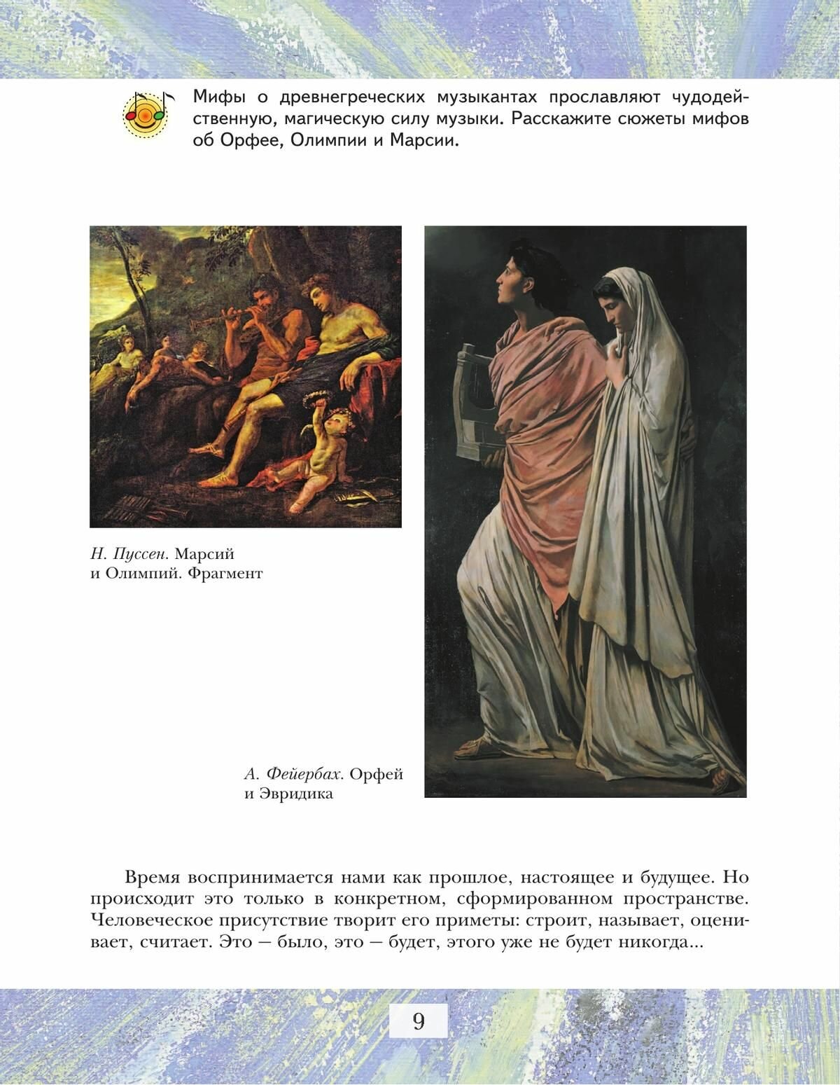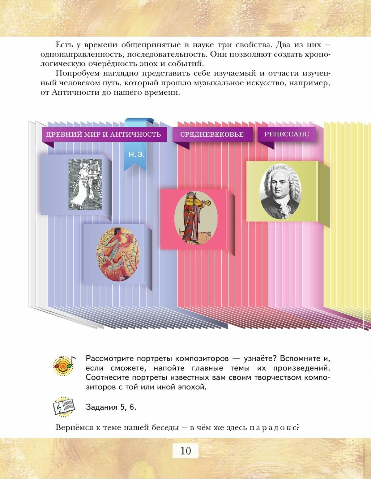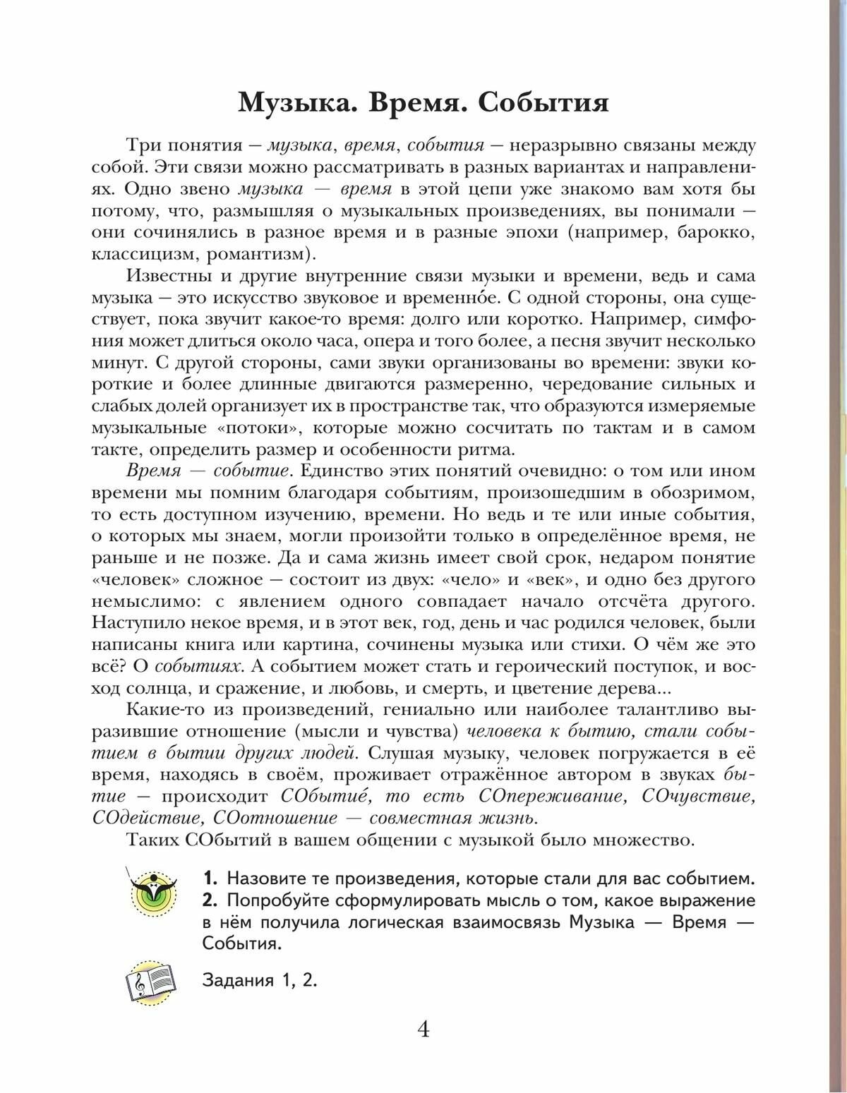 Изучение особенностей музыкальной культуры различных эпох (Античности и Средневековья, барокко, классицизма, романтизма и новейшего времени) происходит на их пересечениях и во взаимодействии с помощью жанровых, тематических и содержательных арок. Учащиеся знакомятся с богатством и разнообразием мира музыкальных звуков (вокальных и инструментальных, в том числе электронных), выразительных возможностей музыкального языка, музыкальных форм, в которых композиторы воплощали свои творческие замыслы.