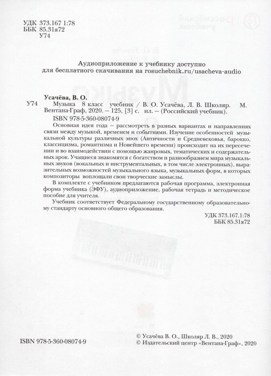 Книга: Музыка. 8 класс. Учебник (Школяр Людмила Валентиновна, Усачева Валерия Олеговна); Просвещение/Вентана-Граф, 2020