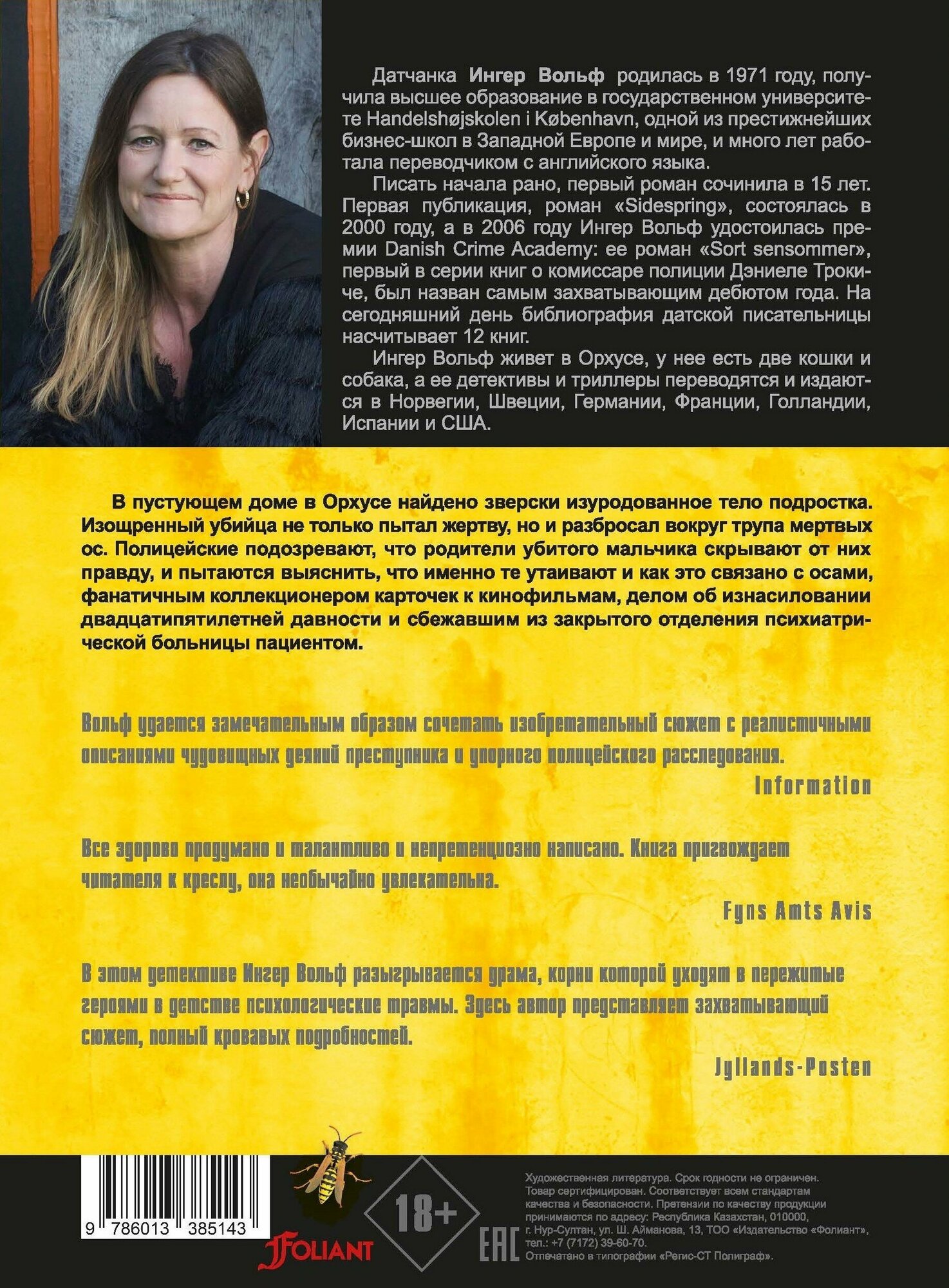"Собиратель ос" - это один из романов в серии детективов о комиссаре Дэниеле Трокиче датской писательницы Ингер Вольф. Психологический триллер вышел в издательстве "Фолиант". Перевела книгу на русский язык писательница Татьяна Русуберг, автор романов "Путешествие с диким гусями" и "Мое лицо первое". В библиографии датской писательницы 12 книг, которые переводятся и издаются в Норвегии, Швеции, Германии, Франции, Голландии, Испании и США.