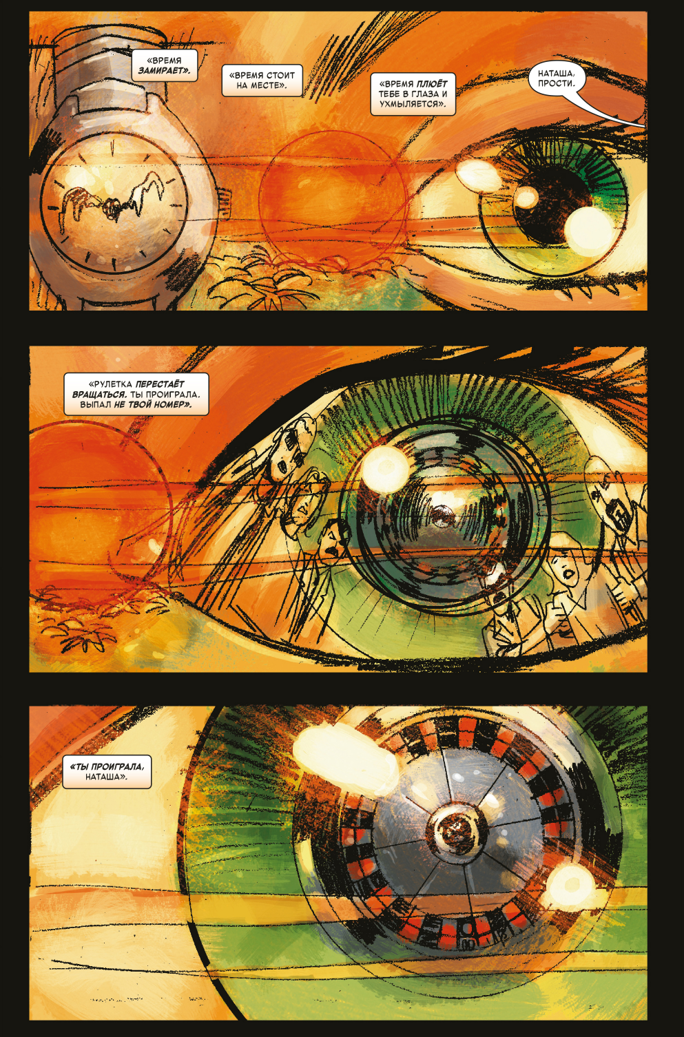 Знаменитый писатель Ричард К. Морган ("Видоизменный углерод") создал невероятно напряженный шпионский триллер о Чёрной вдове, а легендарные художники Билл Сенкевич и Горан Парлов мастерски передали атмосферу смертельной игры опытных убийц, которым уже нечего терять. Забудьте о ярких костюмах, скандинавских богах и полётах между небоскрёбами: здесь работают профессионалы! Только холодный расчёт, политические интриги и неудержимое желание отомстить. Наташу Романову кто-то хочет убить, кто-то использовать в своих целях, а кто-то искренне желает помочь. Вот только сама Чёрная вдова планирует сорвать планы и врагов, и друзей, ведь она ведёт свою собственную игру!
