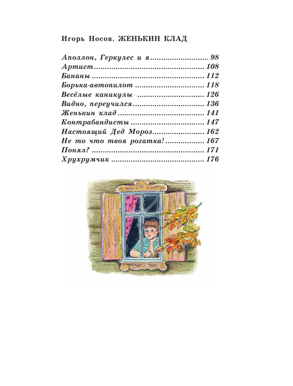 Вторая часть книги - "Женькин клад" Игоря Носова - не повесть, а несколько рассказов, никак не связанных между собой. Некоторые из них смешные и интересные, а некоторые не очень. В первом рассказе из сборника "Аполлон, Геркулес и я" повествование ведется от лица таракана. А в основном рассказы о ребятах, школьниках.