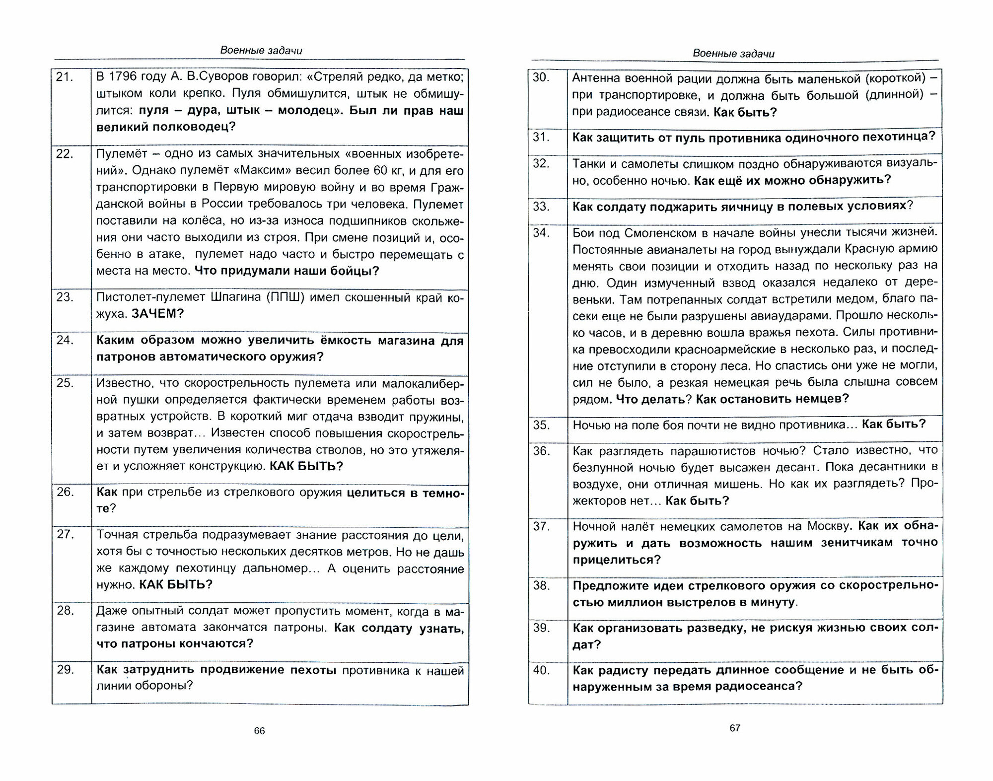Сборник задач ВОВ является энциклопедией доблести и смекалки бойцов, командиров, военных инженеров и защитников родины в тылу страны и предназначена в первую очередь для подрастающего поколения - будущего нашей страны: учащихся школ, студентов, курсантов военных училищ, а также взрослых читателей: родителей, воспитателей, педагогов и всех интересующихся историей нашей страны.