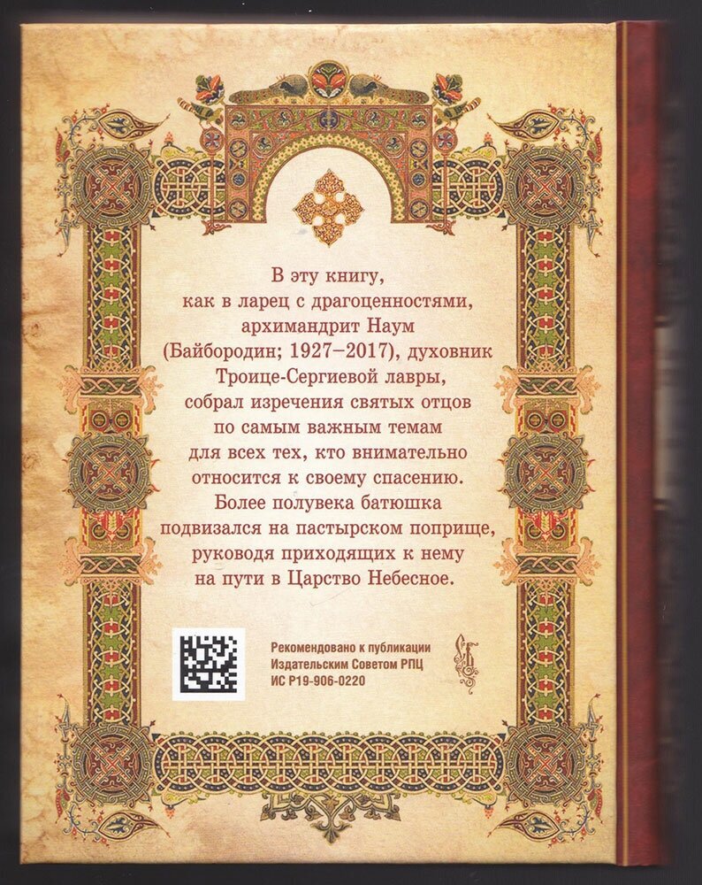 В эту книгу, как в ларец с драгоценностями, архимандрит Наум (Байбородин; 1927–2017), духовник Свято-Троицкой Сергиевой Лавры, собрал изречения святых отцов по самым важным темам для всех тех, кто внимательно относится к своему спасению. Более полувека батюшка подвизался на пастырском поприще, руководя приходящих к нему на пути в Царство Небесное.