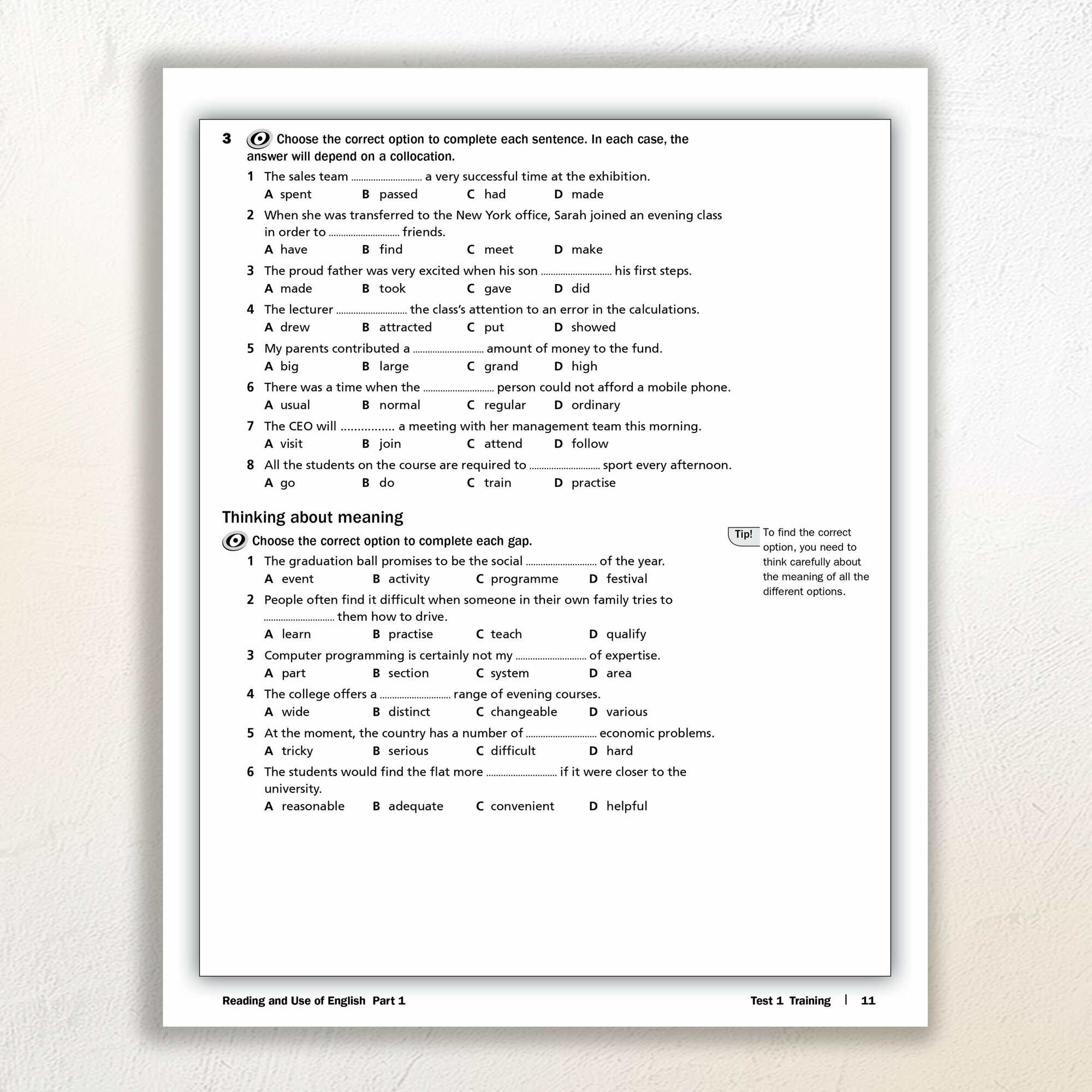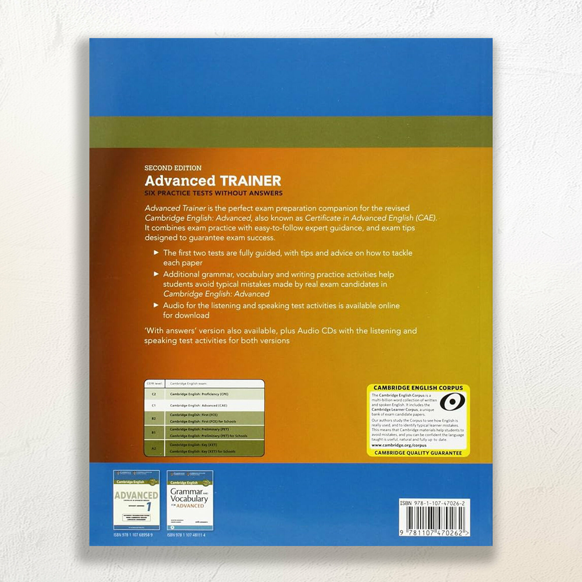Six full practice tests with tips and training for the 2015 revised Cambridge English: Advanced (CAE). Advanced Trainer Second edition offers six practice tests for the revised Cambridge English: Advanced (CAE) exam combined with easy-to-follow guidance and exam tips. The first two tests are fully guided with advice on how to tackle each paper. Extra practice activities, informed by the Cambridge Learner Corpus, a bank of real candidates' exam papers, focus on areas where students typically need the most help. This 'without answers' version is ideal for class use. Audio for the listening and speaking test activities is available online for download. Audio CDs featuring the listening material are also available, separately.