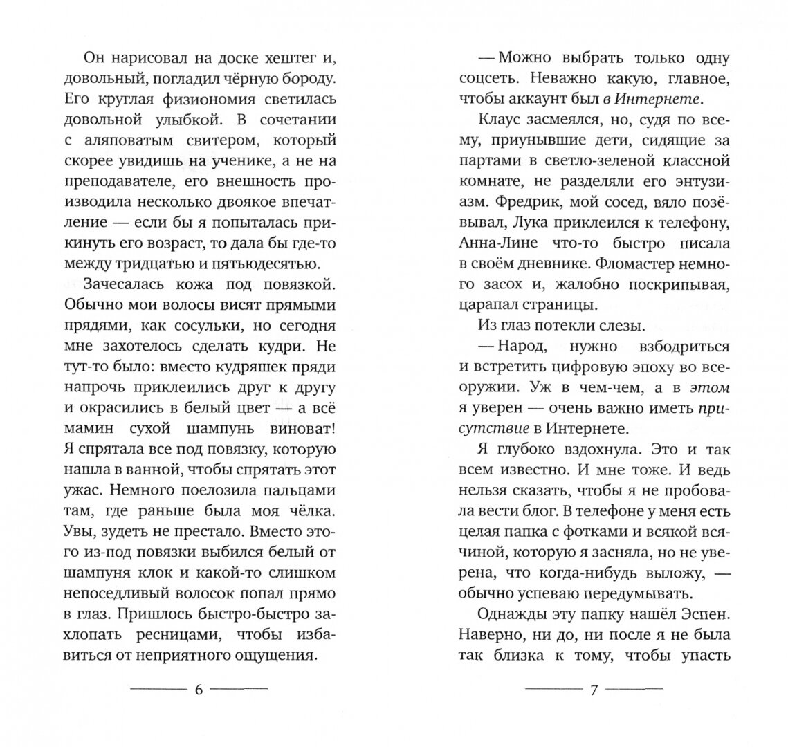 Да, соглашусь с предыдущими рецензиями - книга именно для 11-12 летних девочек. Очень добротно сделанная история и качественный перевод, нигде не коробило от искусственного подделывания под язык подростков. Я не вижу поверхностности, наоборот - довольно динамичная, не затянутая история и дружбы, и первой влюблённости, и поиска своего места в группе сверстников, и нет никакой излишней физиологичности в описании отношений с противоположным полом, которая многих отталкивает в современной литературе Северной Европы. Вместо того, чтобы нудно читать мораль о блогерах, лайках и т.д., можно просто дать ребёнку прочитать эту книжку. И да - книжку оставлю. Потому как актуальная, добротная, милая и добрая.