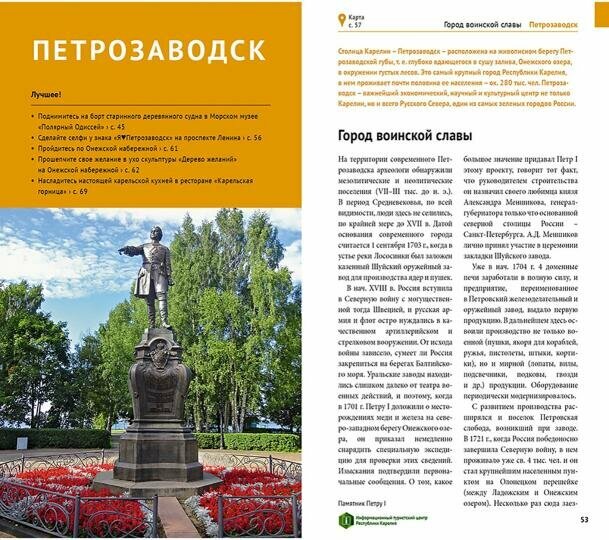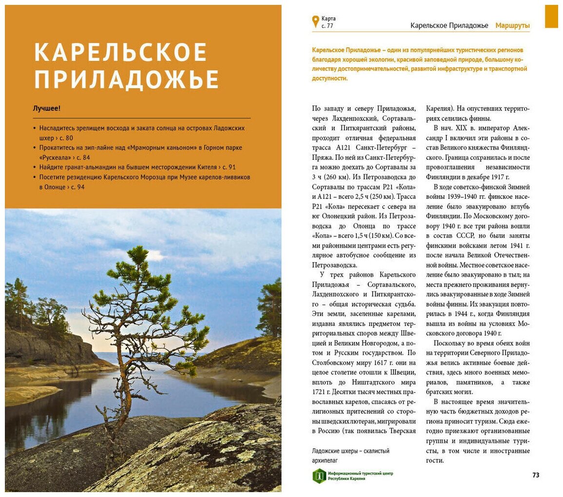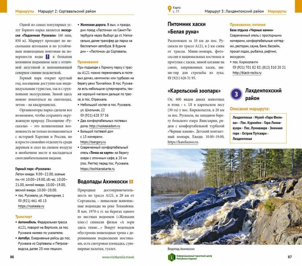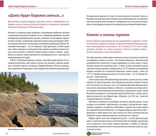 Памятники деревянного зодчества, древние монастыри и храмы, уникальная северная природа, где деревья растут даже на камнях, россыпь островов и живописное побережье Ладожского, Онежского озер… Заповедники, заказники, национальные парки… Удивительные водопады («падуны» в местном обиходе), точное количество которых здесь никто не знает. Свыше 500 объектов военной истории разных эпох… Чудом сохранившиеся небольшие деревеньки, сёла и города, имеющие статус исторических поселений. Для большинства жителей нашей страны Республика Карелия издавна ассоциируется с деревянными церквями Кижей и Валаамом. Именно в эти заповедные места, в первую очередь, стремятся путешественники, чтобы познакомиться с русской культурой. Любители активного отдыха смогут покататься на байдарках и горных лыжах, поплавать в море с белухами, взять уроки у специалистов-дайверов, съездить в гости к карельскому деду Морозу, познакомиться с хаски, «полетать» над мраморным карьером «Рускеала», который пользуется в последнее время огромной популярностью. Тех, кто делает выбор в пользу тишины и уединения, ждет старейший курорт «Марциальные воды», многочисленные гостиницы и кемпинги, расположенные на берегах величественных озер.