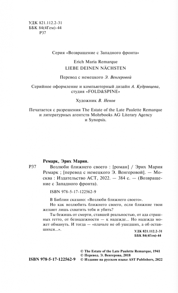"Возлюби ближнего своего" мне дал почитать знакомый. Причём до этого я знать не знала ни о каком Ремарке. И счастлива, что узнала, потому что книга оказалась просто великолепной. Автор пишет так, что ты проживаешь всё действие романа вместе с главным героем, будто находишься рядом с ним в том времени. После чтения книга долго тебя не отпускает, это дорогого стоит. И конечно, я сразу решила, что эта книга должна быть в моей библиотеке, и теперь, благодаря "Читай-городу" она у меня есть. Издание отличное: твёрдая обложка, белые листы, красивое оформление, что ещё нужно для счастья?