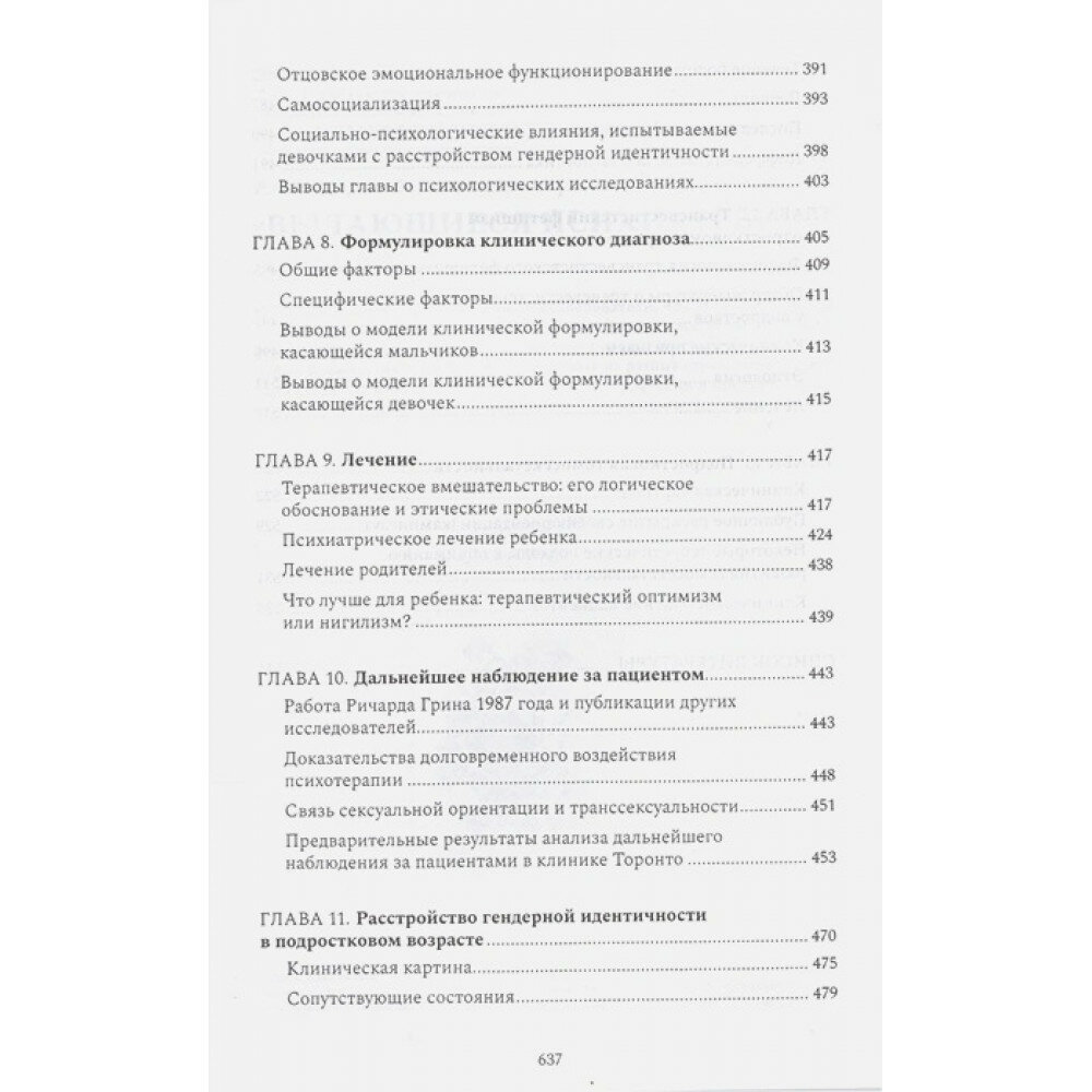 Раздел, посвященный детям (главы 2-10), предлагает подробный анализ расстройств гендерной идентичности как у девочек, так и у мальчиков, что включает в себя важнейшую феноменологию, медицинскую, биологическую, психосоциальную этиологию, клиническую формулировку, лечение, долгосрочное наблюдение.