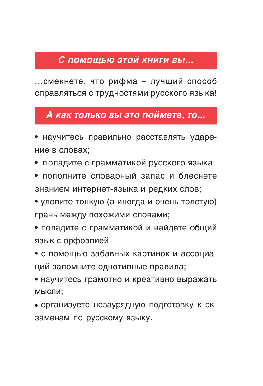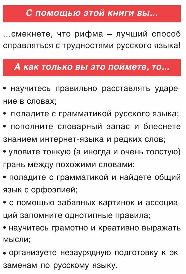 Русский язык - океан с уникальным подводным миром. Оказавшись посреди него, задаешься вопросом: как постоянно держаться на плаву, чтобы не пойти на дно? Ответ прост - рифмовать! Правила и нормы языка, представленные в книге, с легкостью запоминаются благодаря комическим стишкам, забавным картинкам и неожиданным ассоциациям. С книгой школьного учителя и популярного блогера вы пополните словарный запас, научитесь грамотно говорить, писать и креативно мыслить.