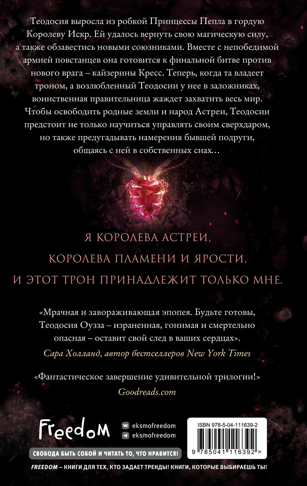 Теодосия выросла из робкой Принцессы пепла в гордую Королеву искр. Ей удалось вернуть свою магическую силу, а также обзавестись новыми союзниками. Вместе с непобедимой армией повстанцев она готовится к финальной битве против нового врага - кайзерины Кресс. Теперь, когда та владеет троном, а возлюбленный Теодосии у нее в заложниках, воинственная правительница жаждет захватить весь мир. Чтобы освободить родные земли и народ Астреи, Теодосии предстоит не только научиться управлять своим сверхдаром, но также предугадывать намерения бывшей подруги, общаясь с ней в собственных снах…