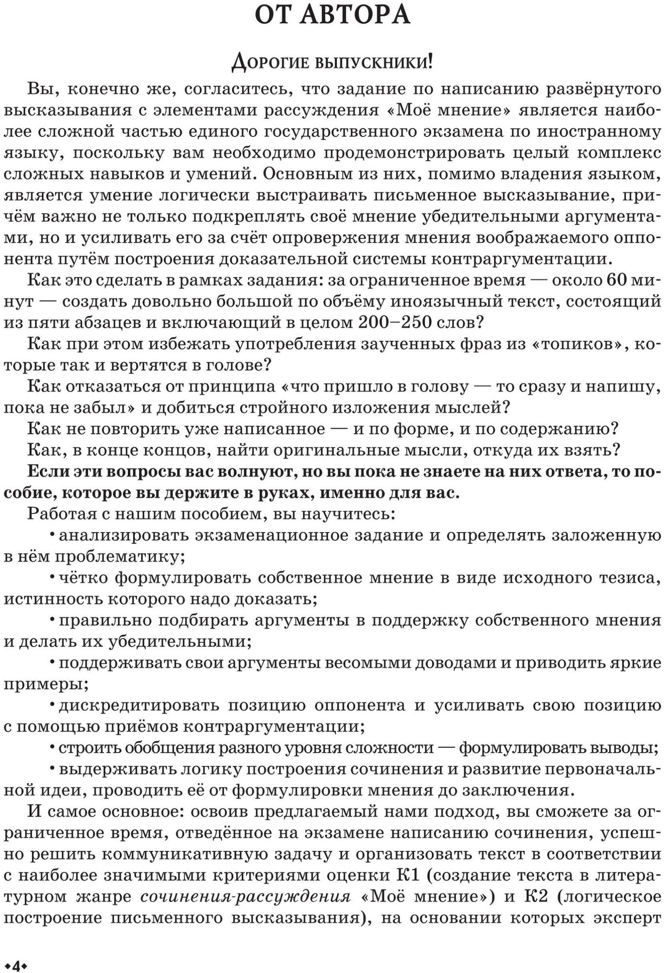 В пособии представлена методика создания развёрнутого письменного высказывания с элементами рассуждения «Моё мнение». Данная методика основана на построении системы аргументации / контраргументации в подтверждение авторской позиции, что является одной из наиболее сложных задач при подготовке к разделу «Письмо» на ЕГЭ.