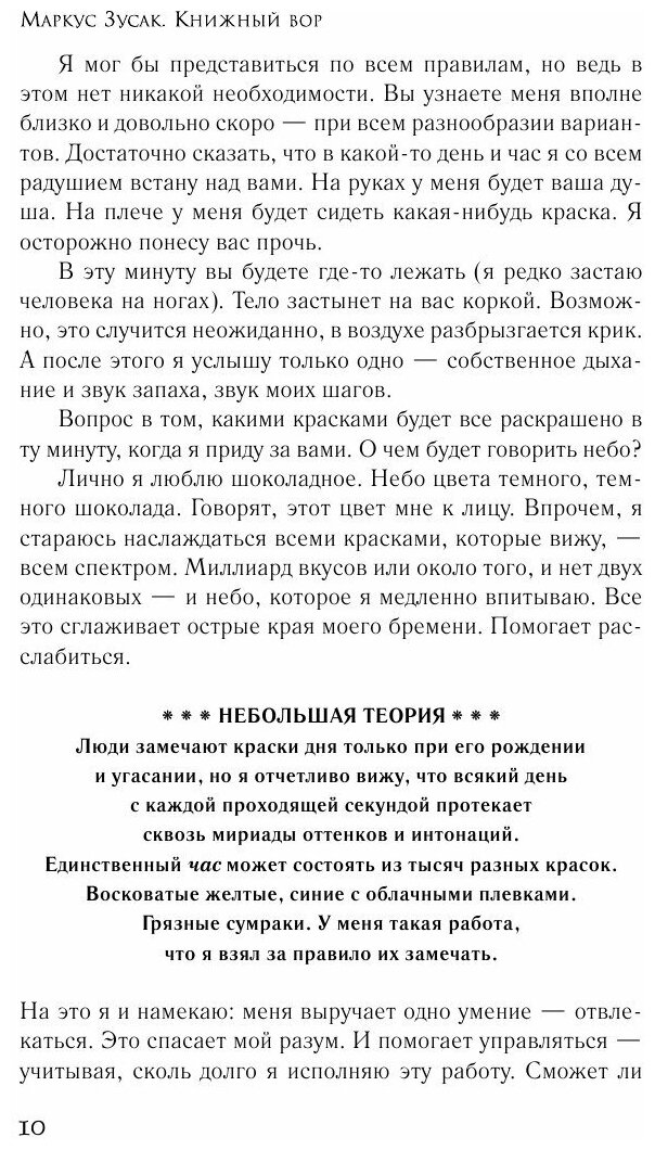Книга просто великолепна! Интересная подача ( повествование ведётся от лица смерти) язык вроде бы и простой, но очень красивые эпитеты и описания! Лично я не очень большой любитель читать книги про войну, но эта книга однозначно у меня в сердце на долго! Не слушайте тех кто говорит что это "переоценено" ,"ненатурально" и т.д. они значит просто слишком (глупы?) в общем не способны по достоинству оценить это произведение!