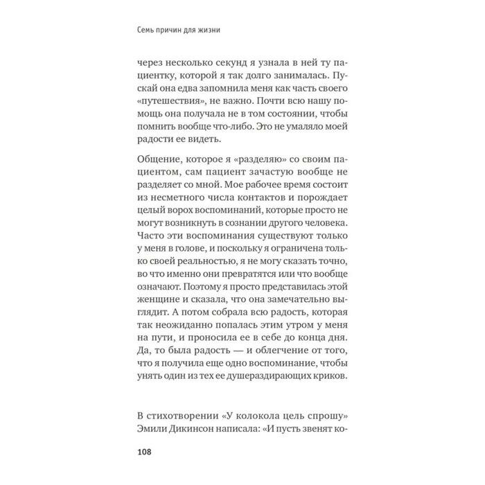 Она врач-реаниматолог. Она несет вахту на границе жизни и смерти. Каждый день она переживает страх, гнев, отчаяние, надежду десятков незнакомых ей людей. В стенах больницы о том, что она чувствует, не должен знать никто. Но в этой книге доктор Ифа Эбби расскажет о семи эмоциях, которые помогают ей удерживать людей по эту сторону жизни, мириться с неизбежным, преодолевать страх фатальных ошибок и никогда не терять надежду. О семи эмоциях, которые позволяют ей чувствовать себя живой и понимать, зачем она живет. Истории врача, ежедневно вступающей в схватку со смертью, и ее пациентов, непохожих друг на друга, помогут каждому найти семь своих причин для жизни.