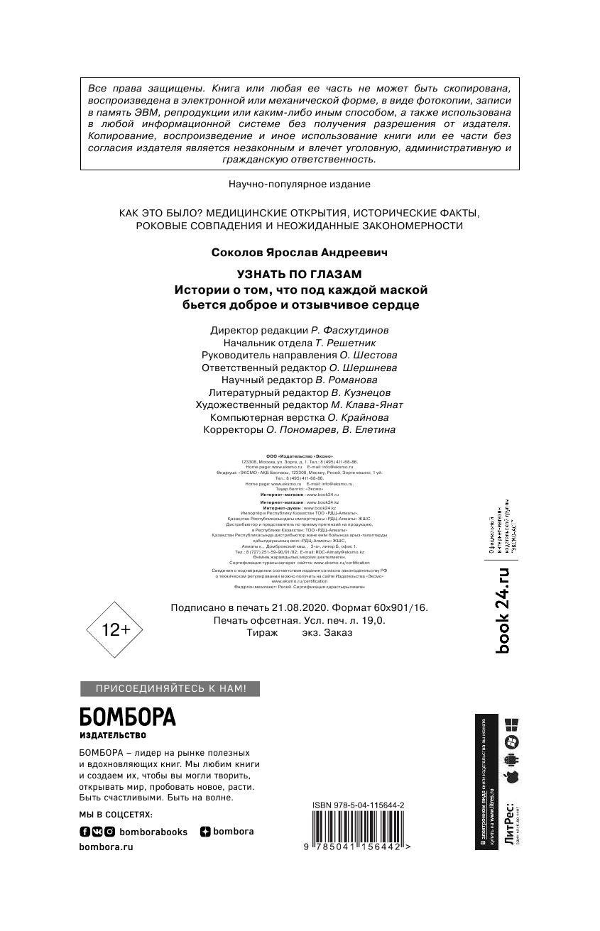 На сегодняшний день товар «Книга: Узнать по глазам. Истории о том что под каждой маской бьется доброе и отзывчивое сердце (Ярослав Соколов); Эксмо, 2020» можно купить с кешбеком в 4 магазинах: ЛитРес, book24, Яндекс.Маркет, Буквоед