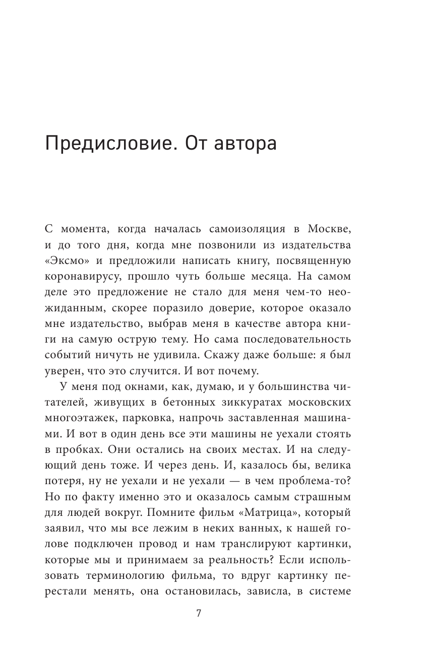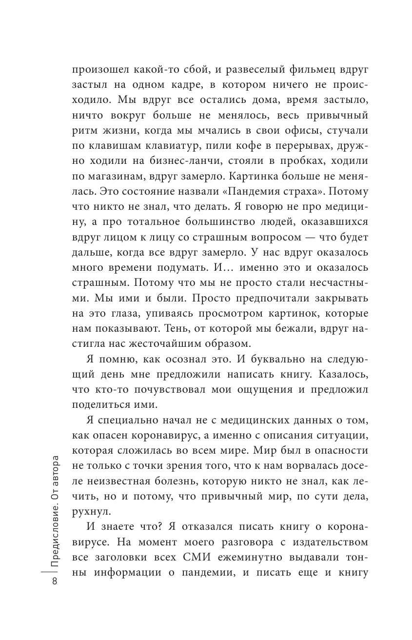 В один день весь мир поставили на "паузу", и мы все оказались героями фильма про жизнь после разрушения. Мы были заперты в своих квартирах, домах, в самих себе. И пока мы боролись с новым распорядком, были те, кто боролся за жизни, те, кто во время пандемии продолжал делать свою работу: врачи, медсестры, волонтеры. Они стесняются называть себя героями, но только их глаза, которые было видно из-под масок, дарили надежду. Эта книга — лакмусовая бумажка на непростом для всех этапе жизни. Здесь собран концентрат чувств, эмоций, боли и любви. Настоящие истории о настоящих людях: инвалид-колясочник, который развозил адресную помощь, врач, который одним добрым словом вернул человеку самоуважение, люди, которые не смогли остаться в стороне и приняли решение помогать. Пока они есть — мир точно не рухнет.
