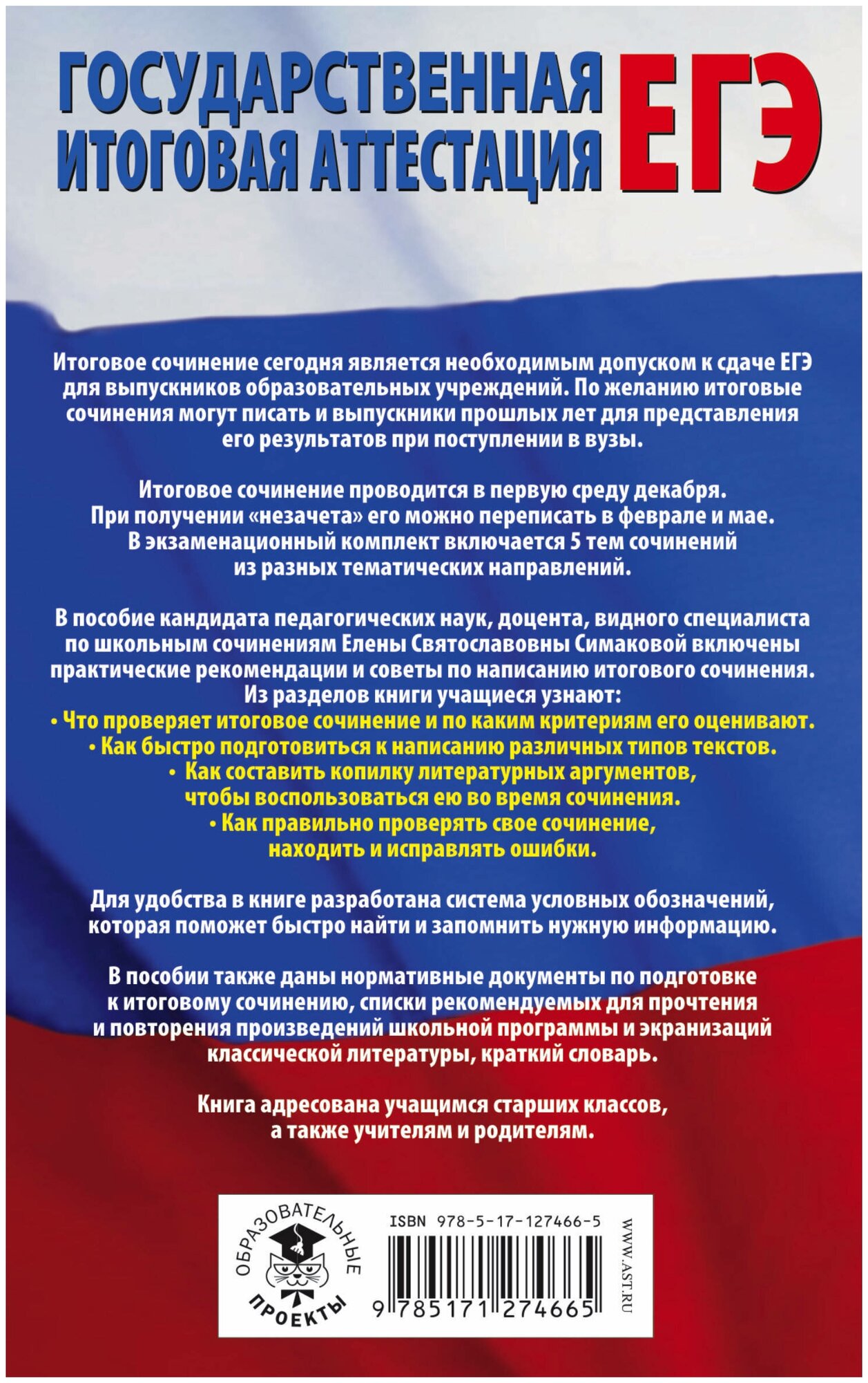 ЕГЭ. Итоговое сочинение на "отлично"! перед единым государственным экзаменом. 10-11 классы (Симакова Елена Святославовна); Образовательные проекты, 2020