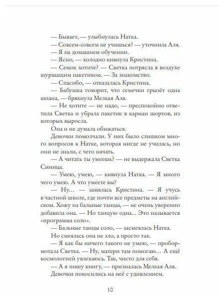Очень странная книга. И девочки, и читатель_ница остаются к финалу с ворохом вопросов. Что за Натка вообще такая, откуда взялась, инициаторка доморощенная? На редкость неприятная персонажка, подозрительная – авторка старательно взращивает в нас недоверие к ней, а в итоге – просто пшик.