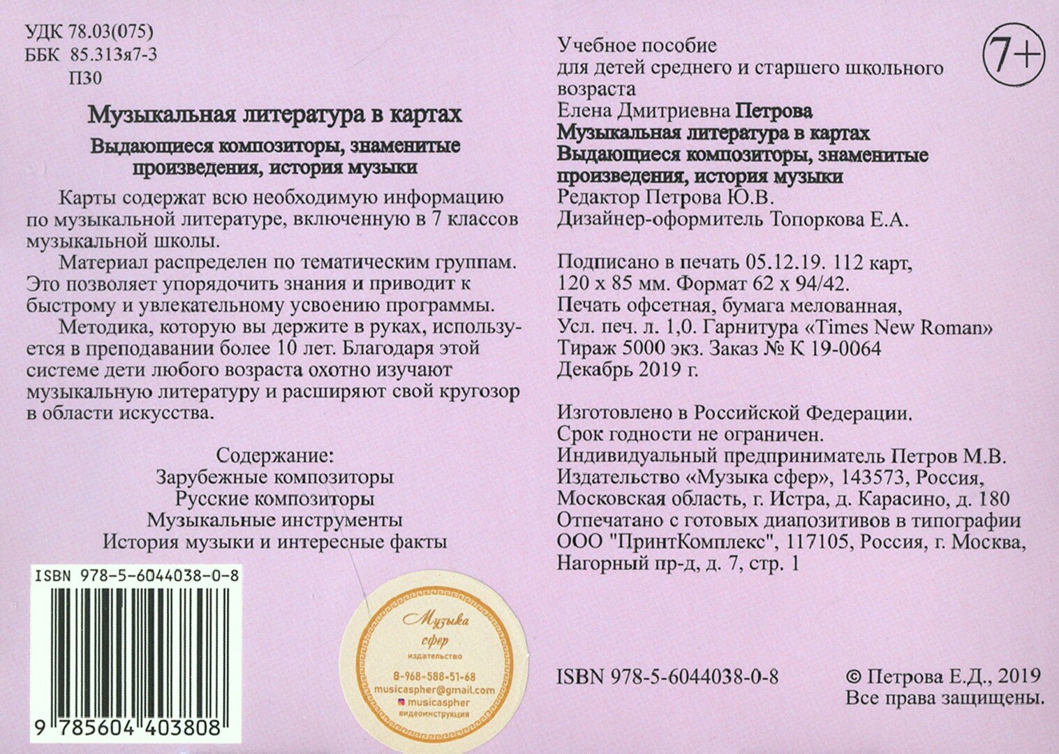 Карты содержат всю необходимую информацию по музыкальной литературе, включенную в 7 классов музыкальной школы.