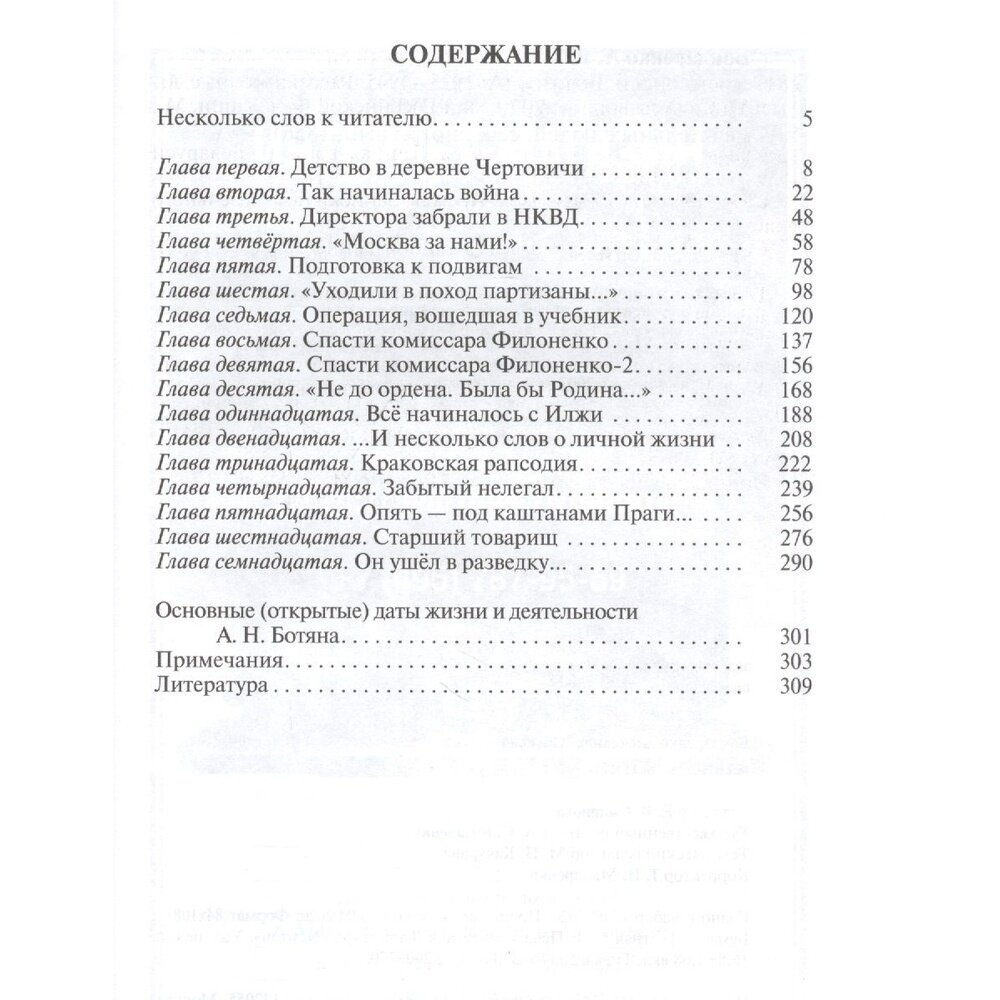 Замечательная книга. А.Ю.Бондаренко подробно изложил ратный путь А.Н. Ботян - воина, разведчика.Высокий профессионализм, мужество, отвага,- черты, характеризующие А.Н. Ботян. Прошедший Великую Отечественную войну он и в мирное время оставался в строю (да и для разведчиков мирное время не существует). Жизненный путь А.Н. Ботян - яркий пример для воспитания у молодых людей чувства патриотизма, любви к Родине.