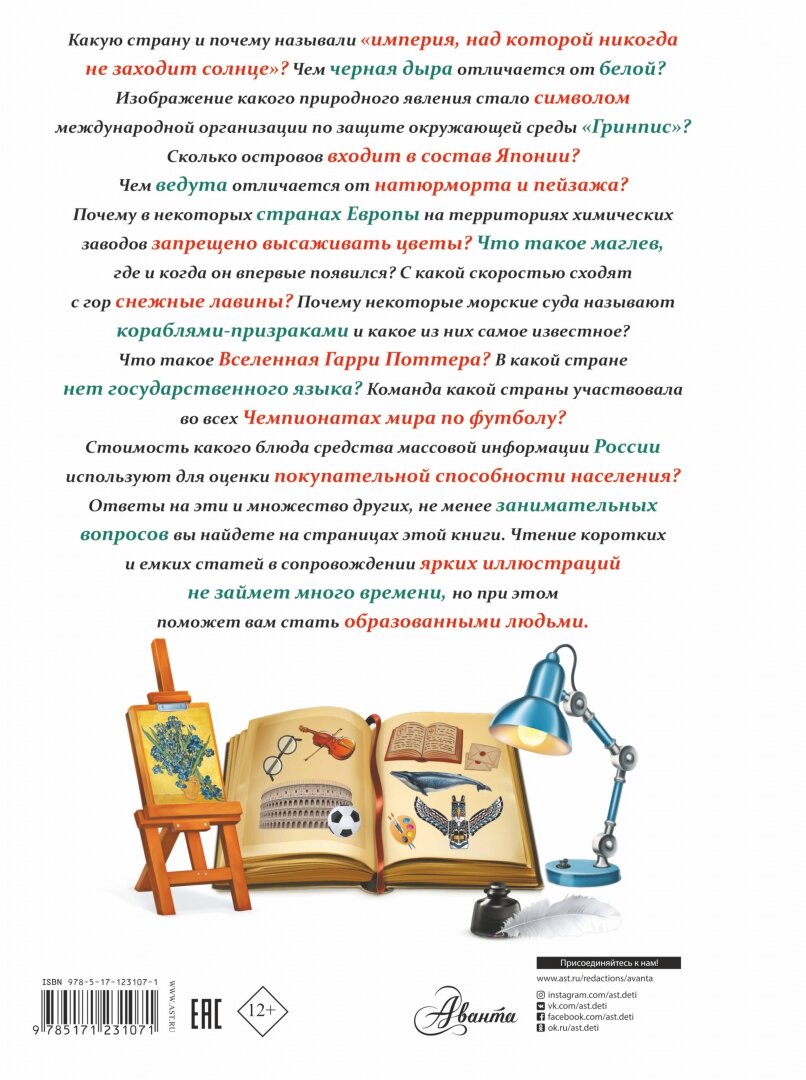 Образованных людей отличает высокий уровень эрудиции, неординарное мышление и, конечно же, чувство юмора. Но при современном напряженном ритме жизни стать образованным не так-то просто, хотя возможностей для этого очень много. Здесь самое главное - желание. И при этом полезном деле надежным подспорьем может стать данная книга, в которой собрано огромное количество важных факторов буквально из всех областей знания. Человек, его анатомия и физиология, культура и искусство, техника и научные достижения, мир животных и растений, природные явления, чудеса света, страны, народы и традиции - всего и не перечислить. Информация, содержащаяся на страницах книги, повысить интеллект, что поможет и ответ на уроке разнообразить, и позволит чувствовать себя гораздо увереннее во время любой беседы. Ведь не каждый может быстро найти ответы, к примеру, на такие вопросы: сколько островов входит в состав Японии, в какой стране нет государственного языка, чем ведута отличается от натюрморта и пейзажа, а черная дыра от белой. Книга предназначена для тех мальчиков и девочек, которые хотят знать больше, а главное - понимают, насколько важно быть образованным человеком.
