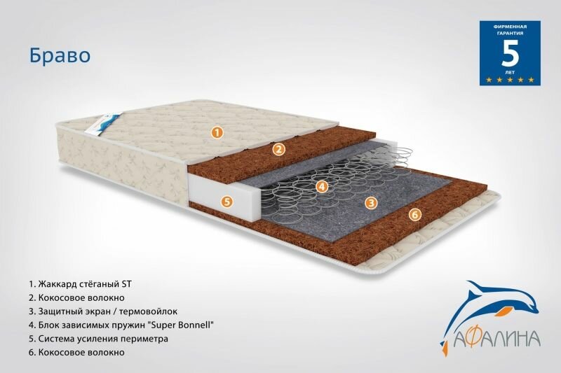 Матрас детский AFALINA браво - симметричной жесткости на основе ортопедической системы пружинного блока "Супер Боннель", высокой комфортности. Матрас специально разработан с учетом анатомических особенностей малыша. Он рекомендован к использованию для детей с целью правильного формирования костной системы и позвоночника. Рекомендуется к использованию с первых дней жизни. Состав: стеганый жаккард "Люкс", пружинный блок "Супер Боннель", термовойлок, кокос натуральный, холлофайбер.