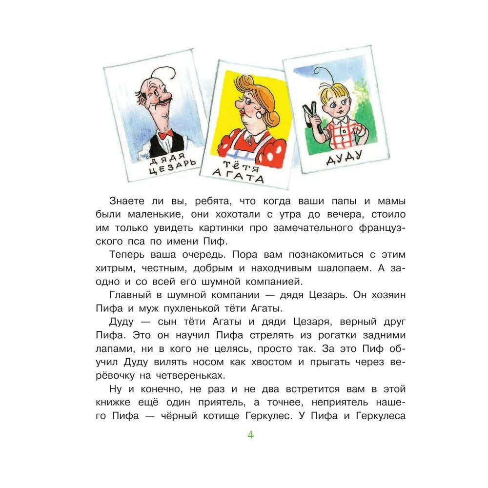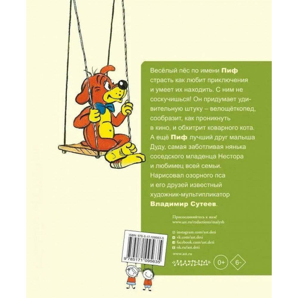 "Приключения Пифа" Григория Остера - это весёлые истории про озорного пса Пифа и его друзей: дядю Цезаря, тётю Агату, малыша Дуду и кота Геркулеса. Пиф может превратить любое даже самое скучное занятие в настоящее приключение. В этом ему помогают остроумие и изобретательность. Ну кто ещё будет пилить дрова, качаясь на качелях?! Яркие и подробные иллюстрации нарисовал художник В. Г. Сутеев.