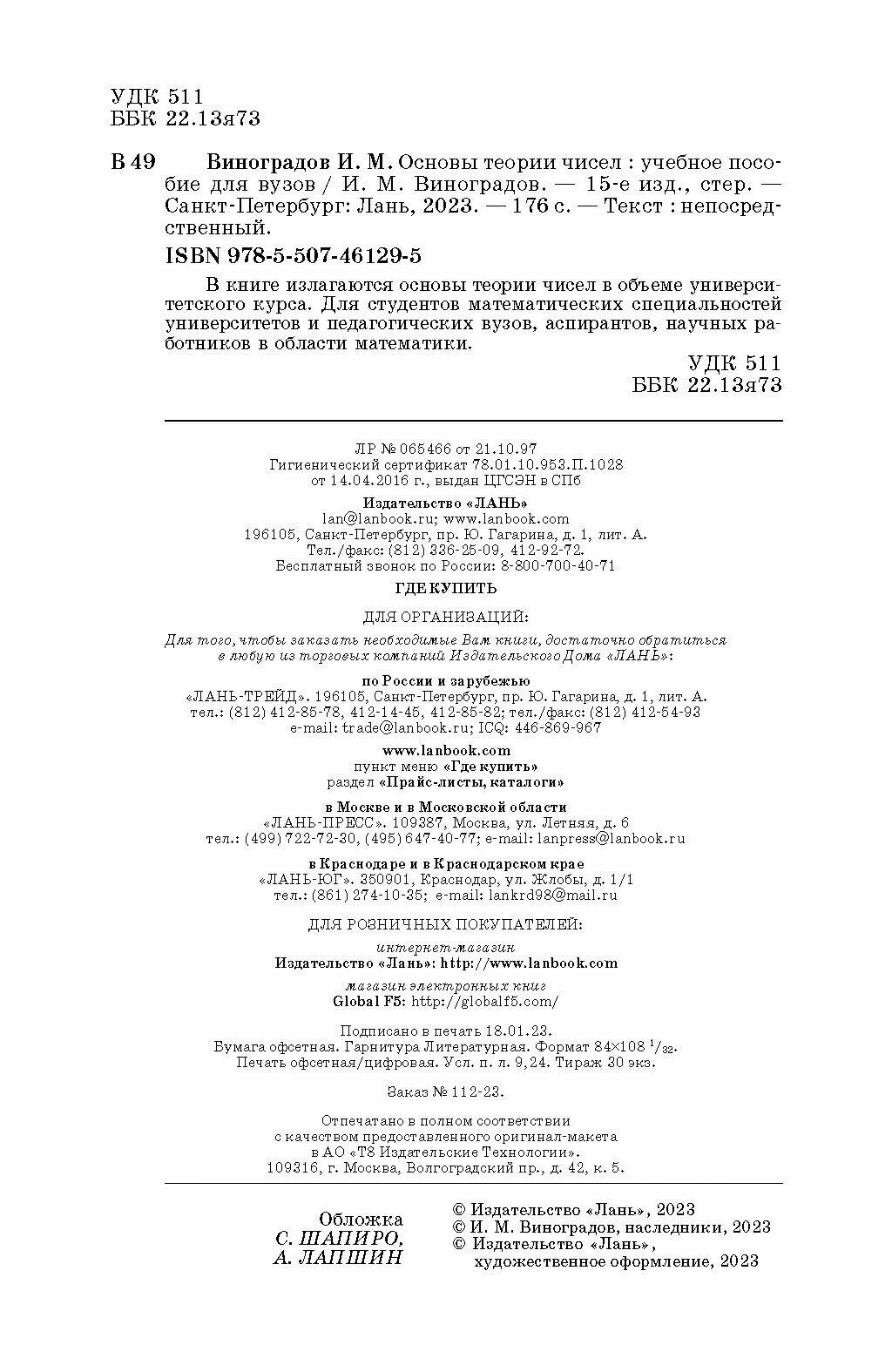 Основы теории чисел. Учебное пособие (Виноградов Иван Матвеевич); Лань, 2023