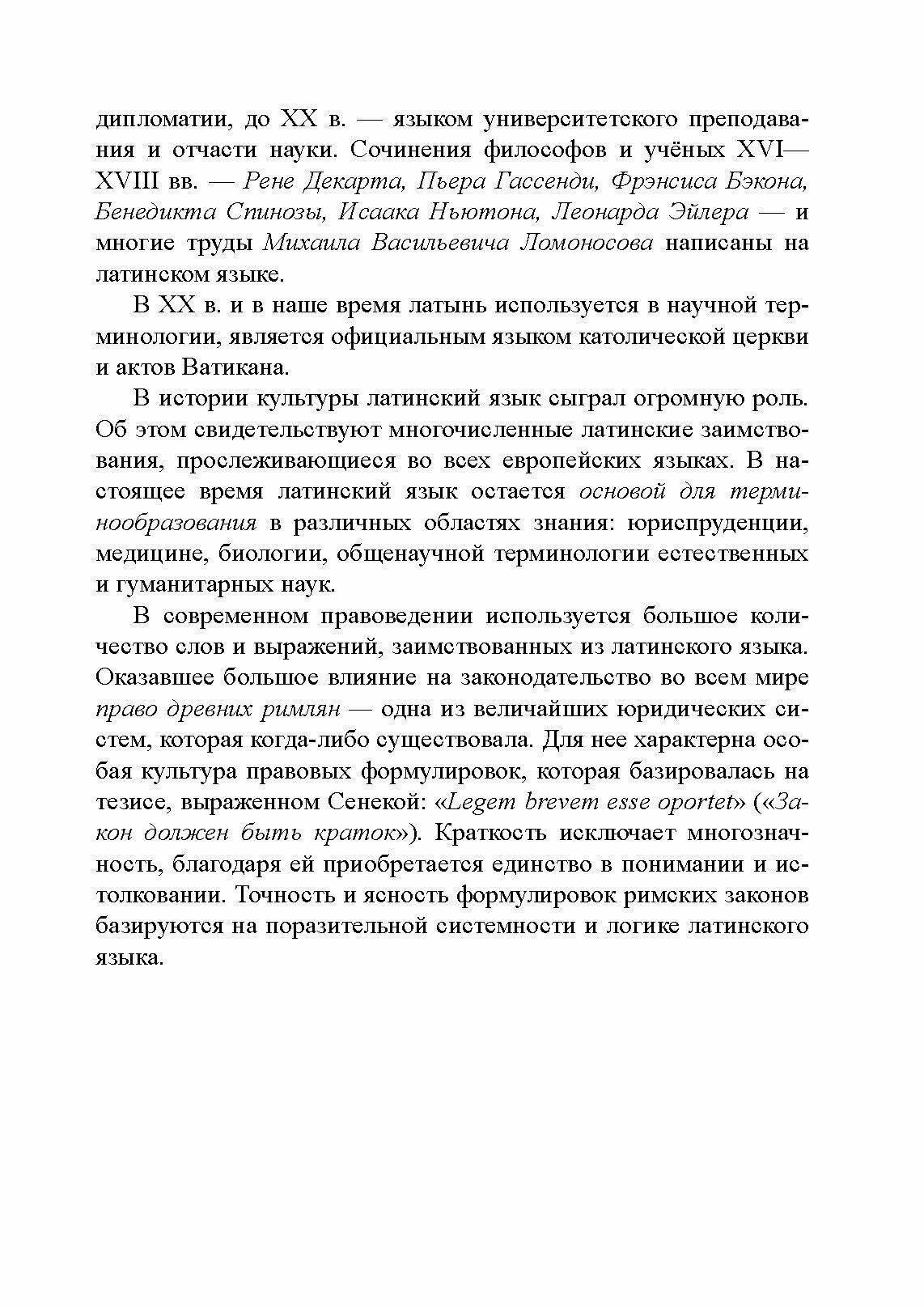В пособии представлен курс латыни, включающий основные сведения о фонетическом и грамматическом строе языка, юридические тексты, термины и афоризмы, краткие словари, материалы специального и лингвокультурного характера, а также систему практических заданий, позволяющих освоить базу древнего языка.