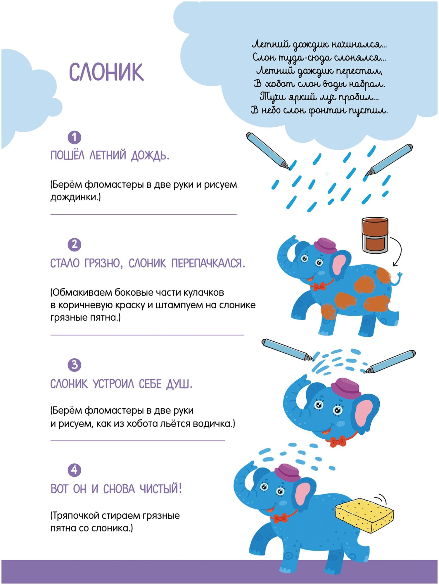 В комплекте 10 многоразовых карточек с особым матовым покрытием. На каждой карточке примеры заданий, пошаговая инструкция и веселая потешка или песенка, которая наверняка понравится вашему малышу. Заданий можно придумать еще больше. Ведь карточки для того и созданы, чтобы развивать творческие способности и воображение.