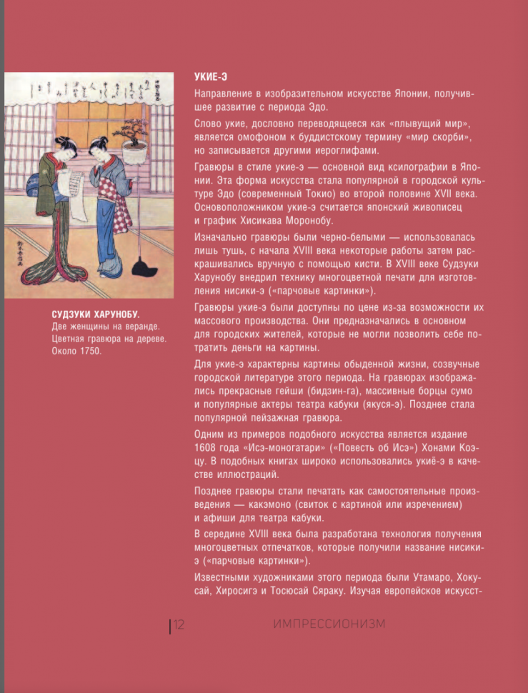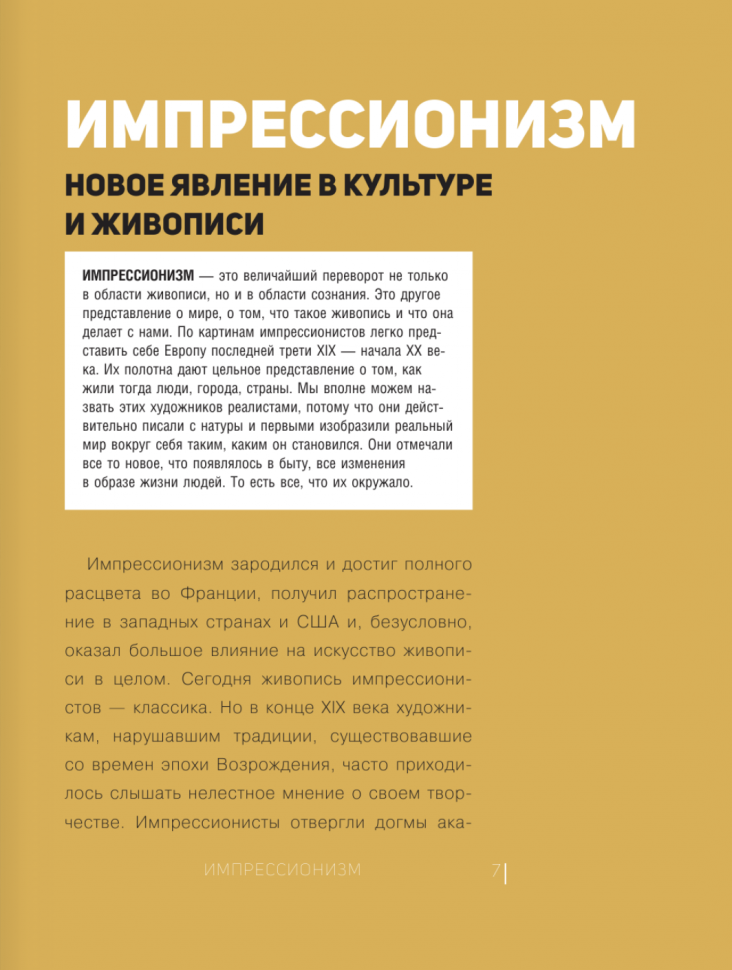 В ваших руках необычная книга. Эта книга – вторая в серии "Искусство для вундеркиндов" – позволит начинающему искусствоведу погрузиться в удивительный, волшебный, яркий и загадочный мир искусства. На этот вас ждет знакомство с феноменом импрессионизма, история которого охватывает всего 12 лет: с первой выставки в 1874 году, где было представлено знаменитое "Впечатление", по последнюю, восьмую, в 1886 году. Эдуард Мане и Эдгар Дега, Клод Моне и Огюст Ренуар, Анри де Тулуз Лотрек и Винсент Ван Гог – эти художники пытались донести до зрителя impression, красоту повседневной действительности, и передать то, что глаз видит в конкретный момент. В итоге их творчество раз и навсегда повлияло на все последующее искусство.