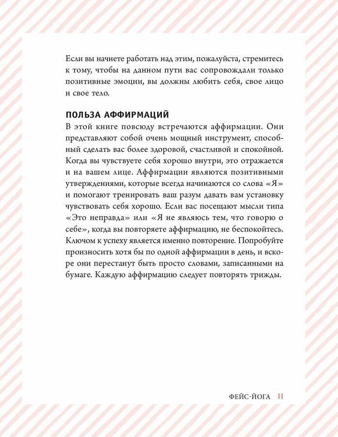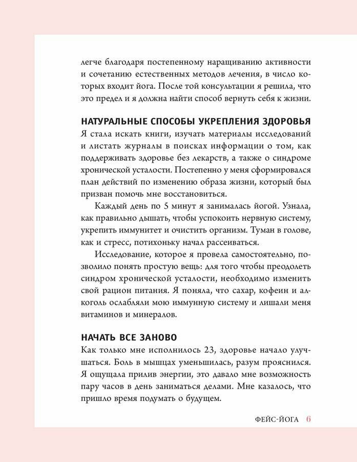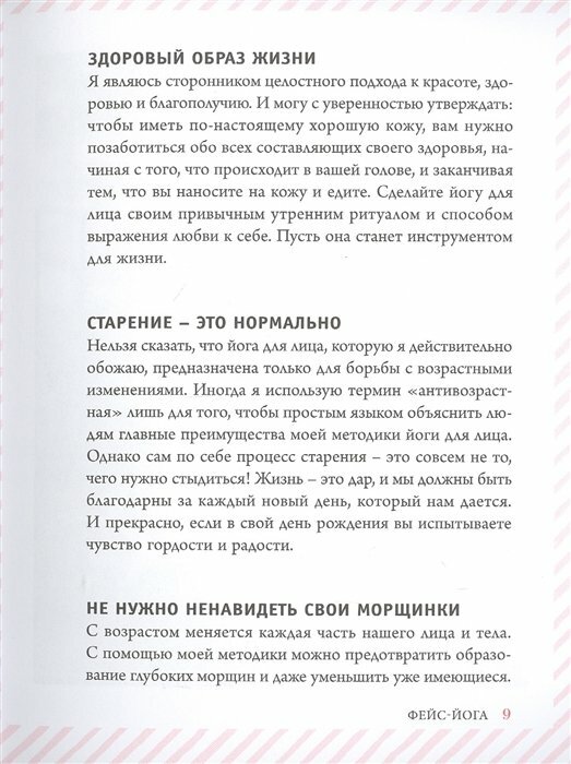 Очень хорошая книга, в которой под названием "Фейс йога" описаны не только упражнения (они еще подкреплены фотографиями), даны массажные техники для каждой зоны лица и шеи, а также приводятся советы по питанию, упражнения из йоги для тела. Своей историей делится автор, как она пришла к своей системе, и как она теперь помогает и вдохновляет других женщин заниматься собой. Книга написана спокойно и размеренно. Читается легко. Я для себя составила программу упражнений и массажных приемов для ухода. Всем, кто хочет оставаться молодым и красивым долго однозначно рекомендую эту полезную книгу к прочтению и действию.