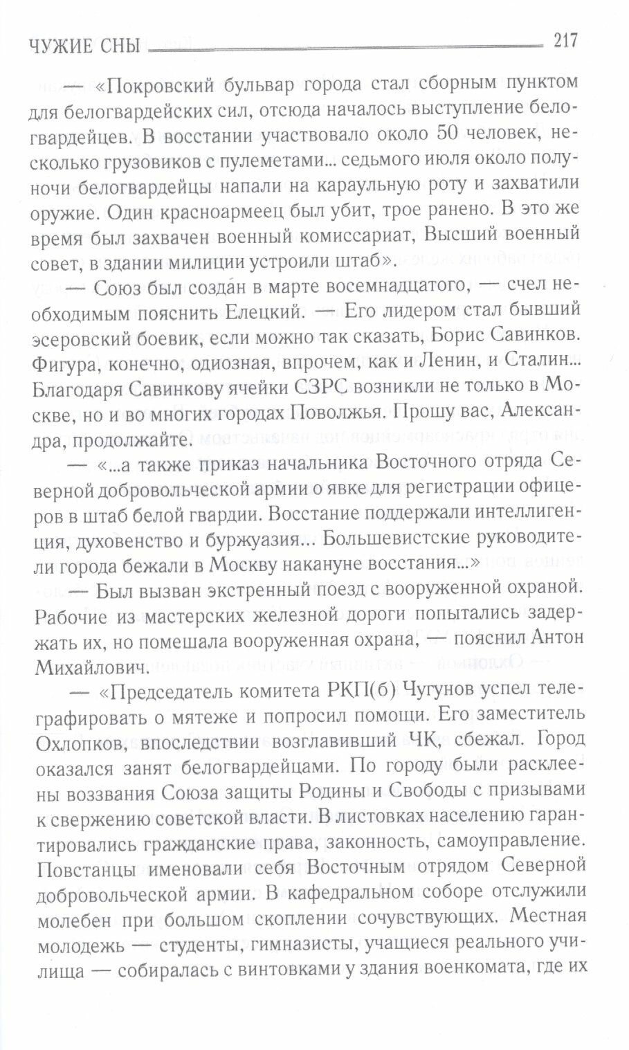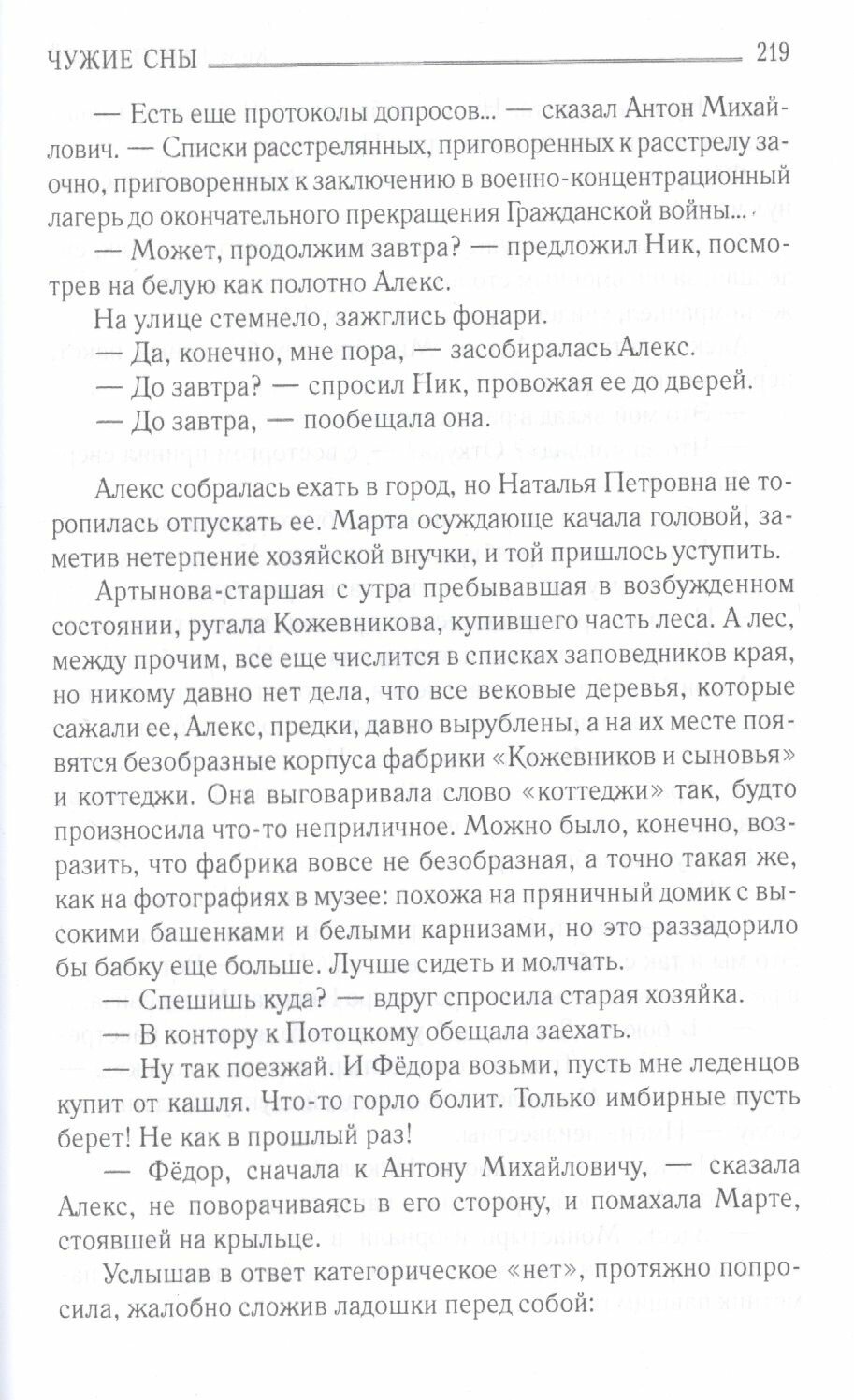 Онемевшее тело. Запаниковала, забилась в четырех стенах, давивших, душивших ее. Запахло гарью. Не спастись... Ее разбудили громкий стук над головой, чьи-то торопливые шаги, плач младенца. "В этом доме я вижу чужие сны", - испуганно подумала Алекс. Судьбы нескольких поколений, характеры, взаимоотношения, яркие описания мест, природы и любовь - кажется, все стороны человеческой натуры, время и сама жизнь становятся объектами внимания