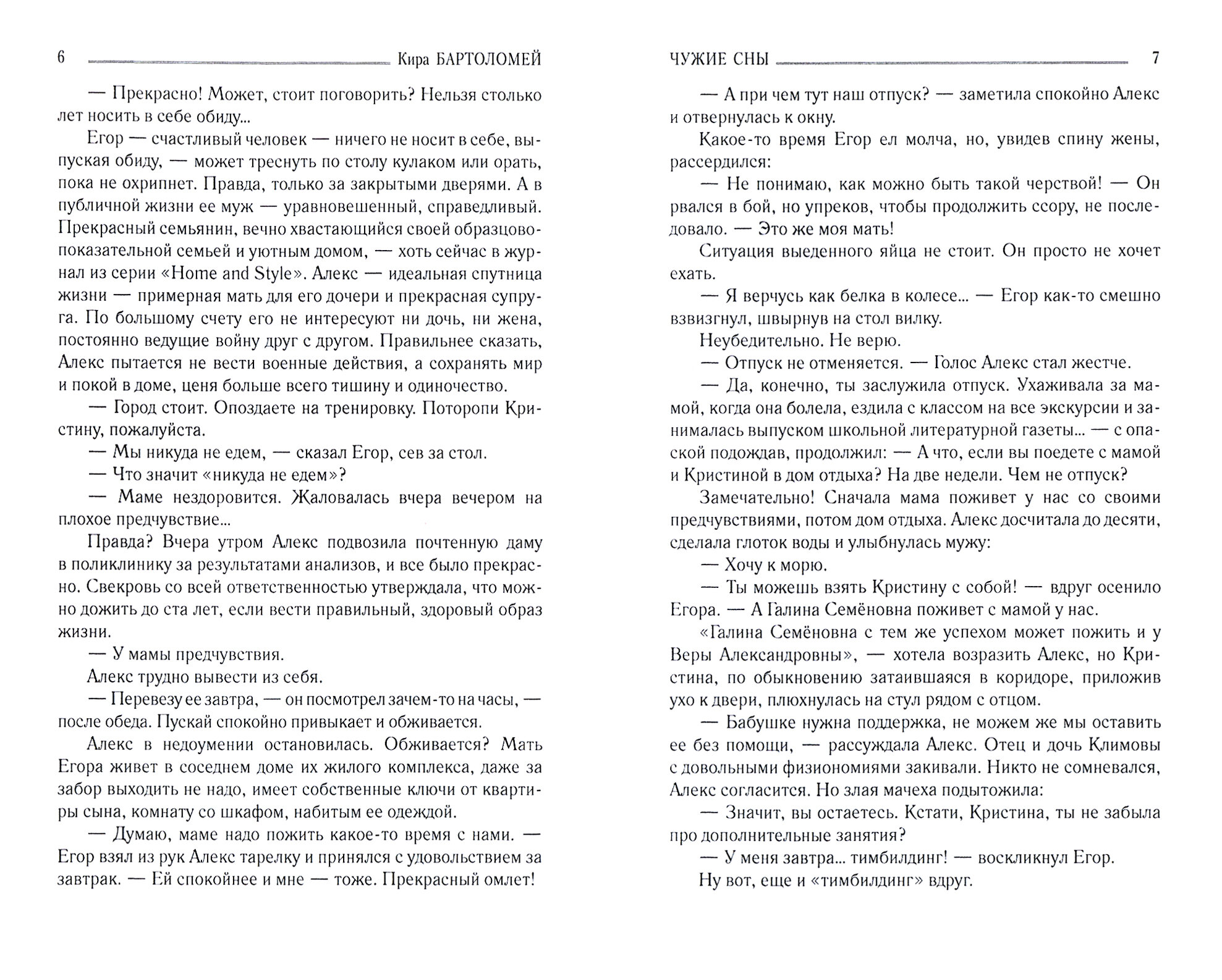 Судьбы нескольких поколений, характеры, взаимоотношения, яркие описания мест, природы и любовь - кажется, все стороны человеческой натуры, время и сама жизнь становятся объектами внимания автора новой книги "Чужие сны" Киры Бартоломей.