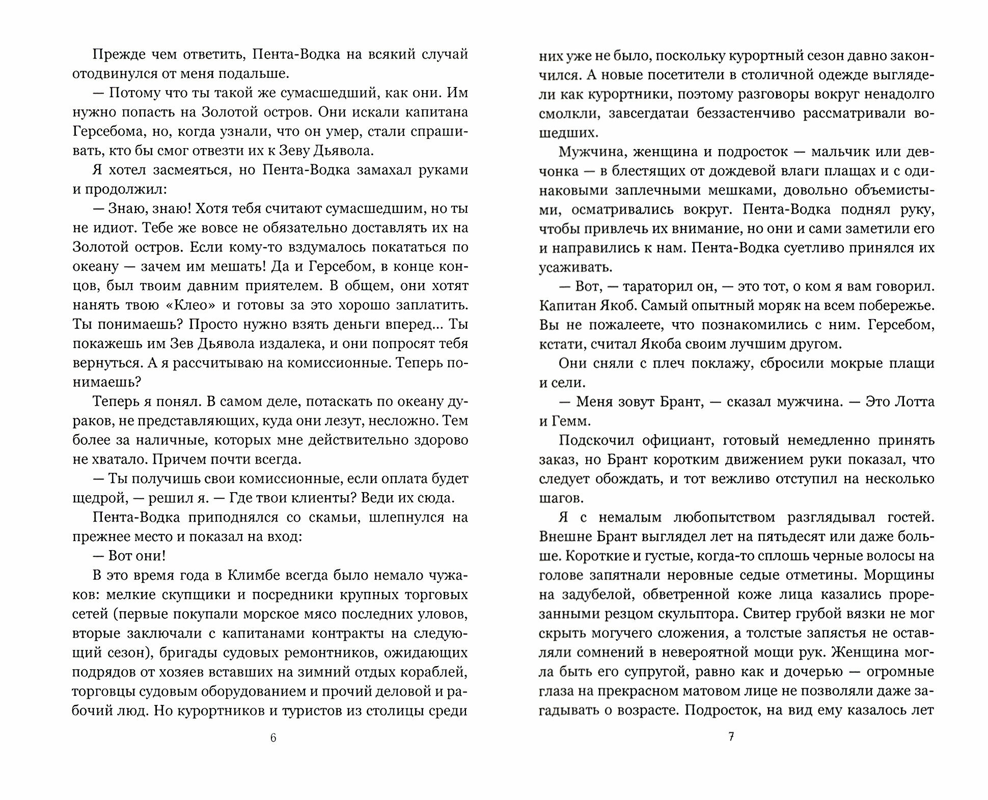 Трое межзвездных странников в портовом кабачке позабытой колонии на далекой планете нанимают лучшего шкипера, чтобы тот доставил их на таинственный Золотой остров. По пятам их преследуют загадочные темные личности, вкруг острова, не стихая, бушует смертоносный ураган, а путь к заветному берегу преграждают неприступные скалы. Но что-то толкает беглецов на верную гибель, заставляя стремиться прямо в Зев Дьявола...