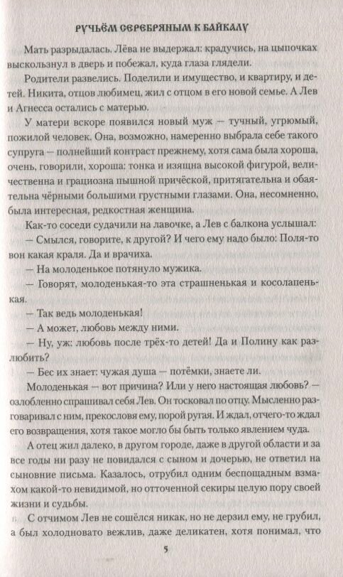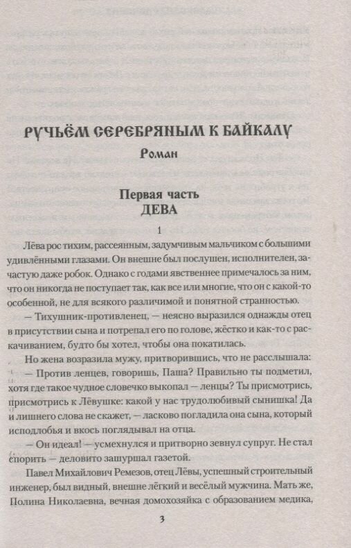 Роман известного сибирского писателя А. Донских "Ручьём серебряным к Байкалу" - это история о возможности или невозможности счастья, о преступлении и наказании, о злодеянии, граничащем с подвигом, и о подвиге, похожем на злодеяние. Жизнь главного героя Льва Ремезова посвящена настойчивым поискам любви в самом высоком смысле этого слова. Пример собственных родителей, исковеркавших судьбы друг друга, приводит его к мысли о том, что свою спутницу мужчина должен выбирать и воспитывать с младых ногтей, буквально сотворив её для себя. Так в его жизнь входит Машенька, дочь старого приятеля…