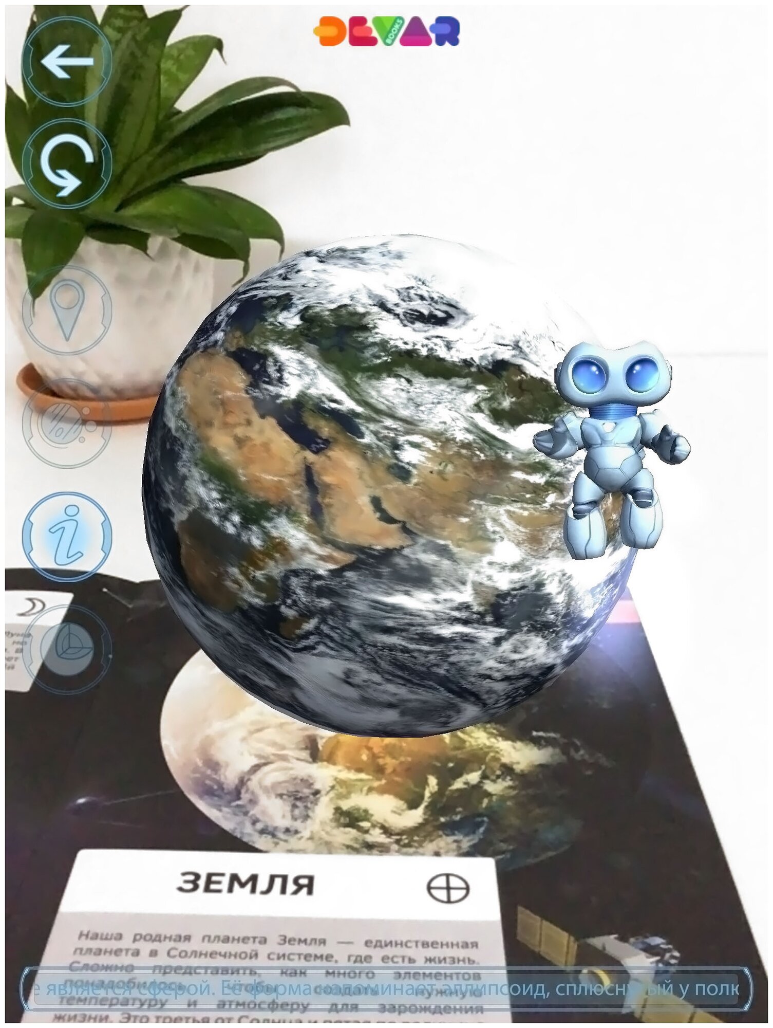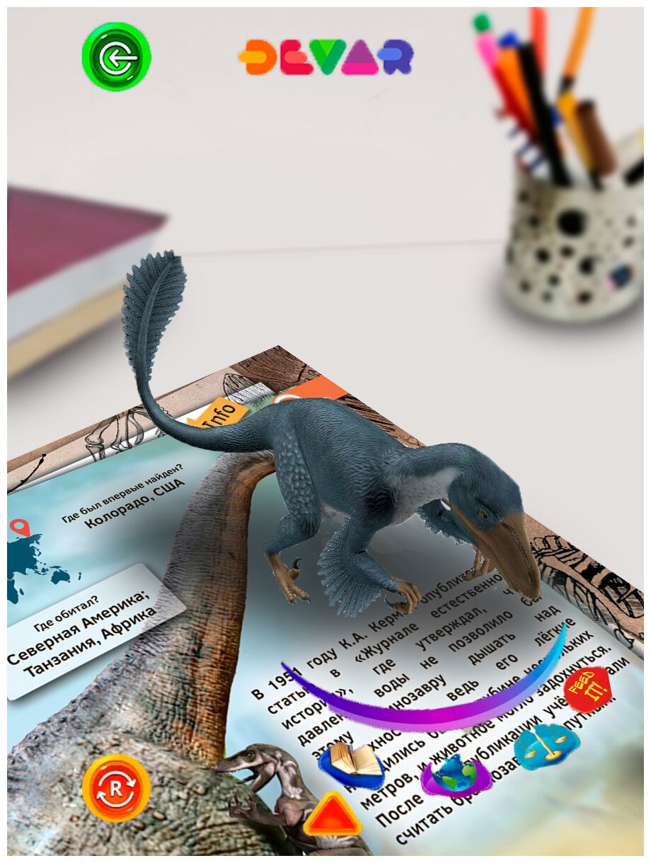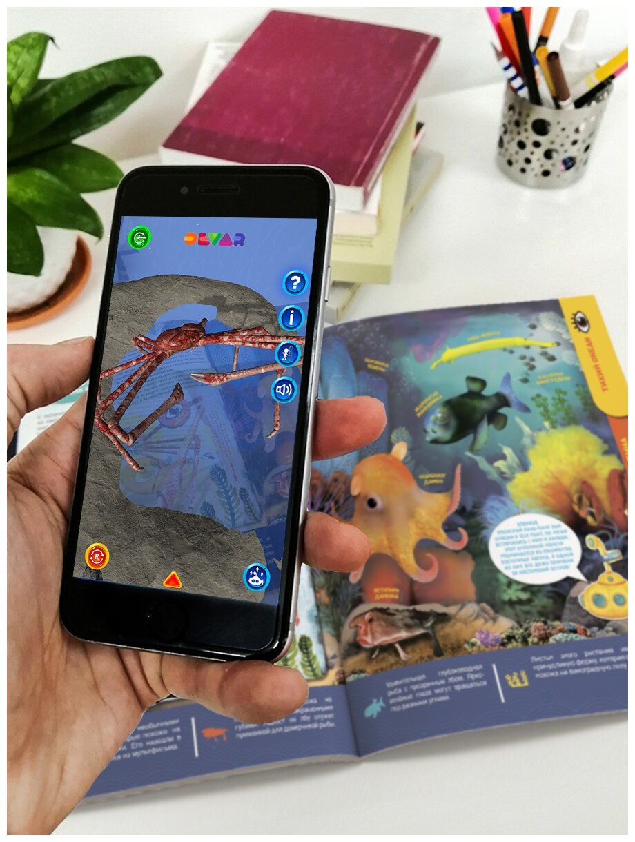 Отсканировав страницу с помощью бесплатного приложения DEVAR, ваш ребёнок увидит, как её персонажи оживут, и сможет узнать о них новую информацию и закрепить прочитанное через виртуальное взаимодействие с героями. Не секрет, что для успешного усвоения знаний современными детьми обычного чтения недостаточно. Необходима вовлечённость ребёнка в процесс обучения через личный опыт. Именно на это нацелены энциклопедии с дополненной реальностью DEVAR. Проводите эксперименты, исследуйте, путешествуйте вместе с DEVAR!