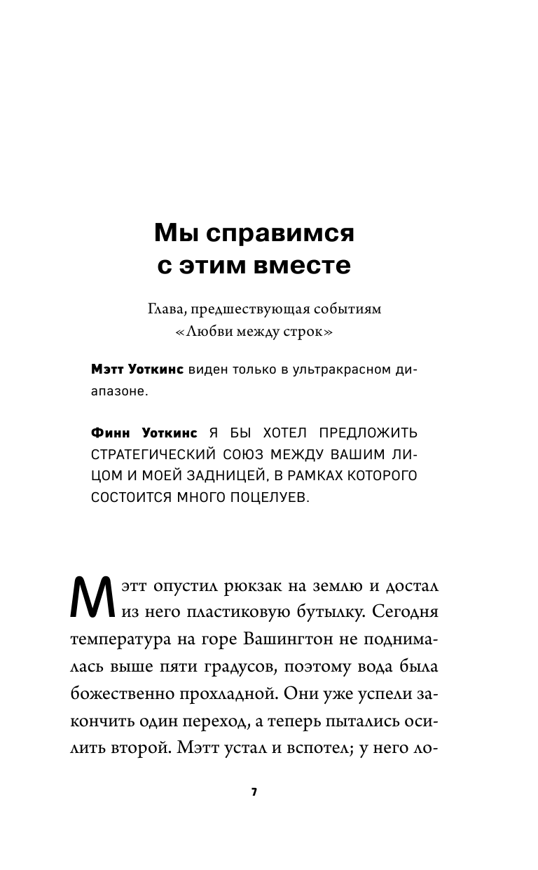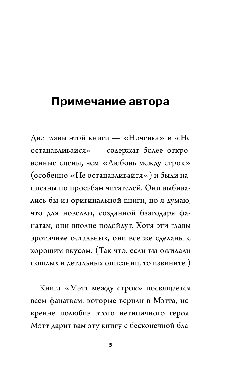 После прочтения первой книги "Любовь между строк" буквально влюбилась в Мэтта. И какова же была моя радость, когда узнала, что есть вторая книга, в которой события описываются со стороны Мэтта. Прочитав ее, как-то расстроилась, даже почувствовала себя обманутой: книга тоненькая, шрифт крупный, отступы большие. По большому счету, читать-то практически и нечего.... Правда, порадовали последние 2 главы, именно в них описывается продолжение первой книги. Несмотря на маленький объем, о покупке не жалею, прочитала с удовольствием.