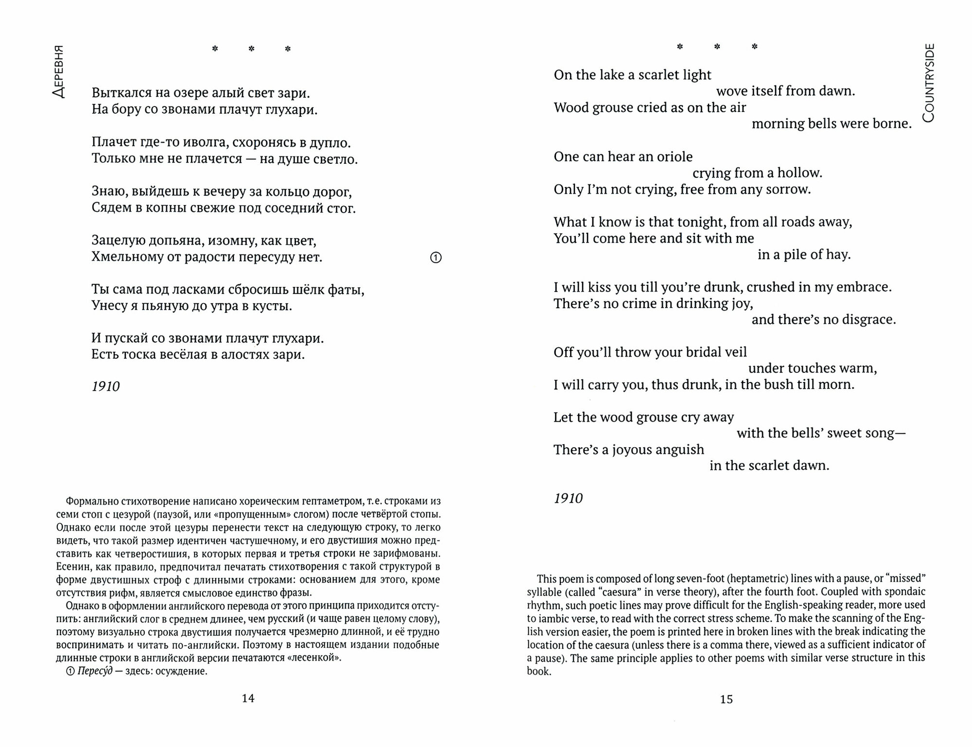 Замечательное издание стихотворений С.Есенина.Прекрасный перевод и комментарий Д.И.Ермоловича.Чувствуется с какой душой автор перевода подходил к каждому произведению.Параллельные тексты позволяют сравнивать реалии русского языка в переводе на английский. Очень интересно со стилистической точки зрения.