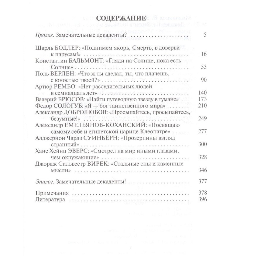 Новая книга известного историка и собирателя Василия Молодякова представляет декадентство как культурное явление мирового масштаба в портретах его характерных фигур. История жизни великих декадентов — трех французских (Шарль Бодлер, Поль Верлен, Артюр Рембо) и трех русских (Константин Бальмонт, Валерий Брюсов, Федор Сологуб) — хорошо известна (все они представлены книгами в серии «Жизнь замечательных людей»), поэтому французы показаны прежде всего через их восприятие в России, русские — через восприятие ими французского декадентства. Галерею дополняют Александр Добролюбов — самый последовательный из русских декадентов — и Александр Емельянов-Коханский — пример коммерциализации литературной моды через скандал. Британское декадентство представлено не растиражированным Оскаром Уайльдом, а менее известным в России, но более талантливым поэтом Алджерноном Суинбёрном, германское — эстетом и автором «ужастиков» Хансом Эверсом, американское — единственным и неповторимым Джорджем Виреком.