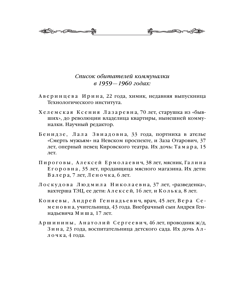Детективная линия, если честно,слегка хромает - не всегда логично и слишком запутанно. Зато очень атмосферно описана жизнь ленинградской коммуналки начала 60-х годов. В книге больше прошлого,чем настоящего. Хитросплетение человеческих судеб ,объединенных общими квадратными метрами. Интересные факты о Блокаде Ленинграда. Я ,например, не знала,что были случаи каннибализма и даже существовали целые банды приторговывающие человечиной. Что ели кошек,голубей и крыс -знала. Но людей .... В итоге, меня больше заинтересовала историческая линия. Книга ,в целом, очень понравилась.